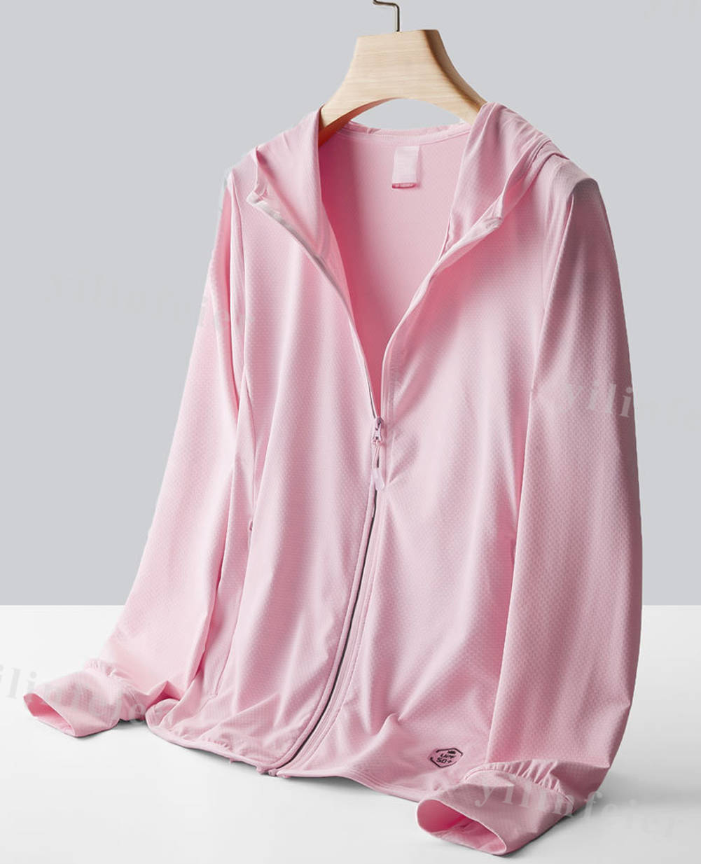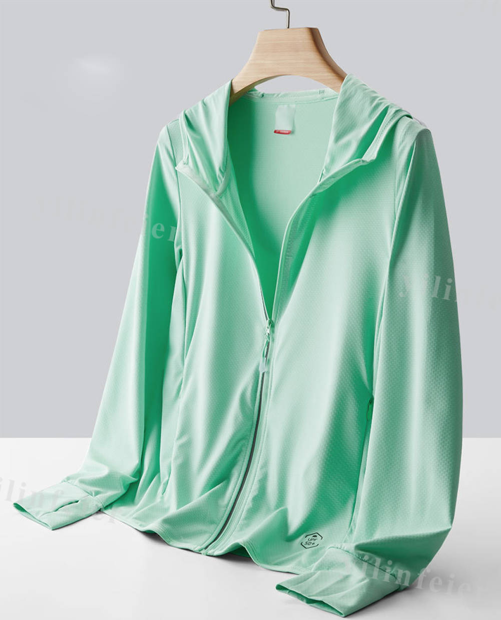 【実用性が高い日焼け止め長袖】指穴付きになったデザインで、手の甲までしっかり覆えるのがポイントです。フロントファスナーはフードの端まで伸ばしているので、ケアしづらい首もラッシュガード着用で肌を守ります。調整できるフード付き、脱着しやすいジップ仕様、ファスナー付きフロントポケットは落とすことなく、小物の収納に大変便利。