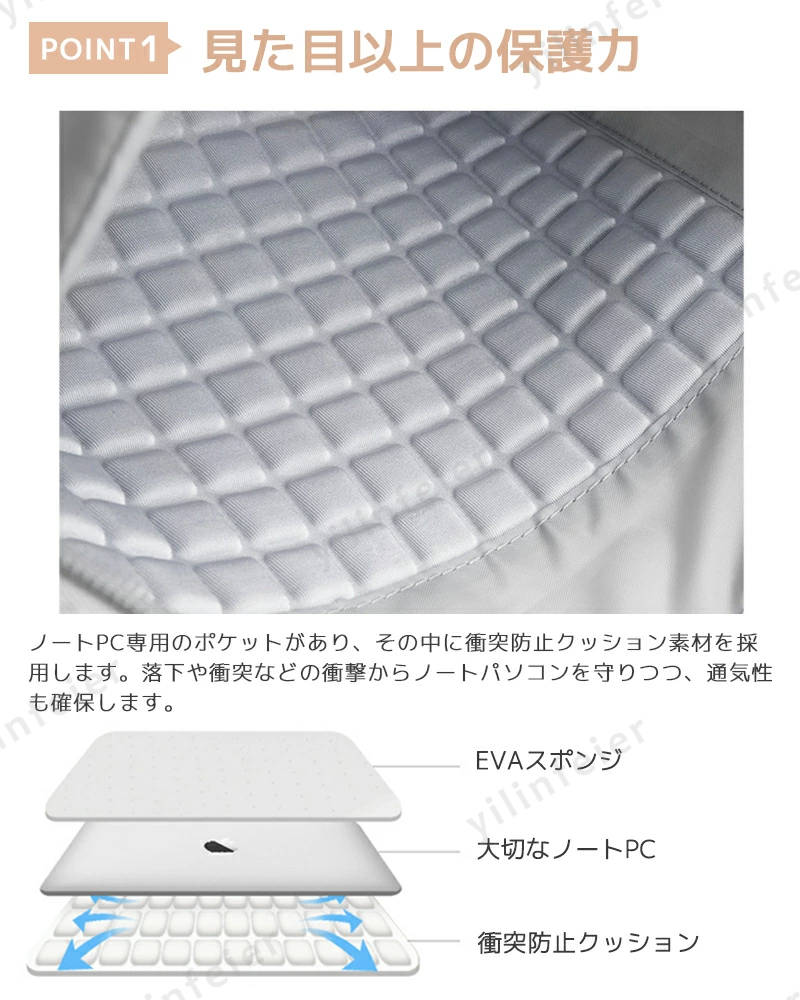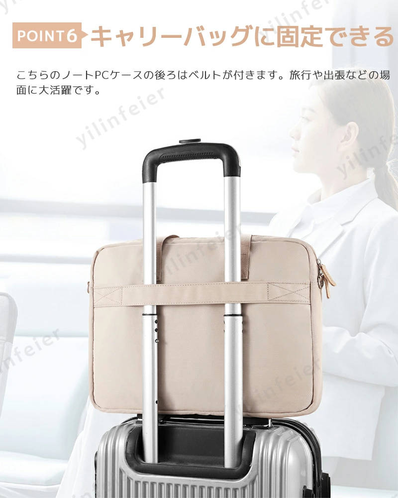 3.ご使用後はよく陰干しをし、直射日光を避け風通しのよい場所で保管ください。商品説明 【収納効果抜群&出張便利】大容量、多機能のポケット付きので、マウス、充電器、USBケーブル、大学ノート、折り畳み傘などたくさんのアイテムが収納できます。また、背面側にはスーツケースにセットアップできるキャリーバー通しを装備されています。通勤、出張、通学、日常のお出かけなどいろんなシーンで快適に持ち運びができるおしゃれでコンパクトなPCケースです。