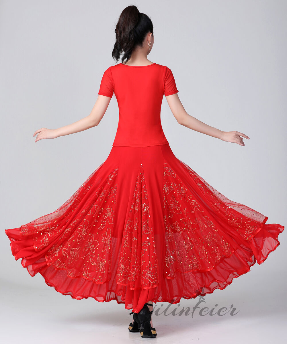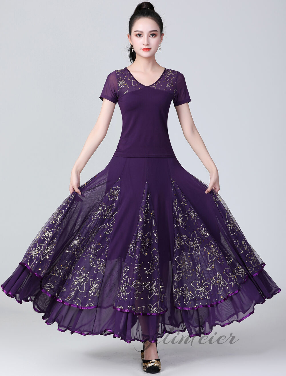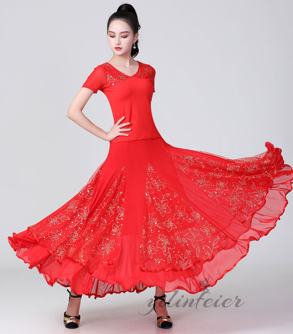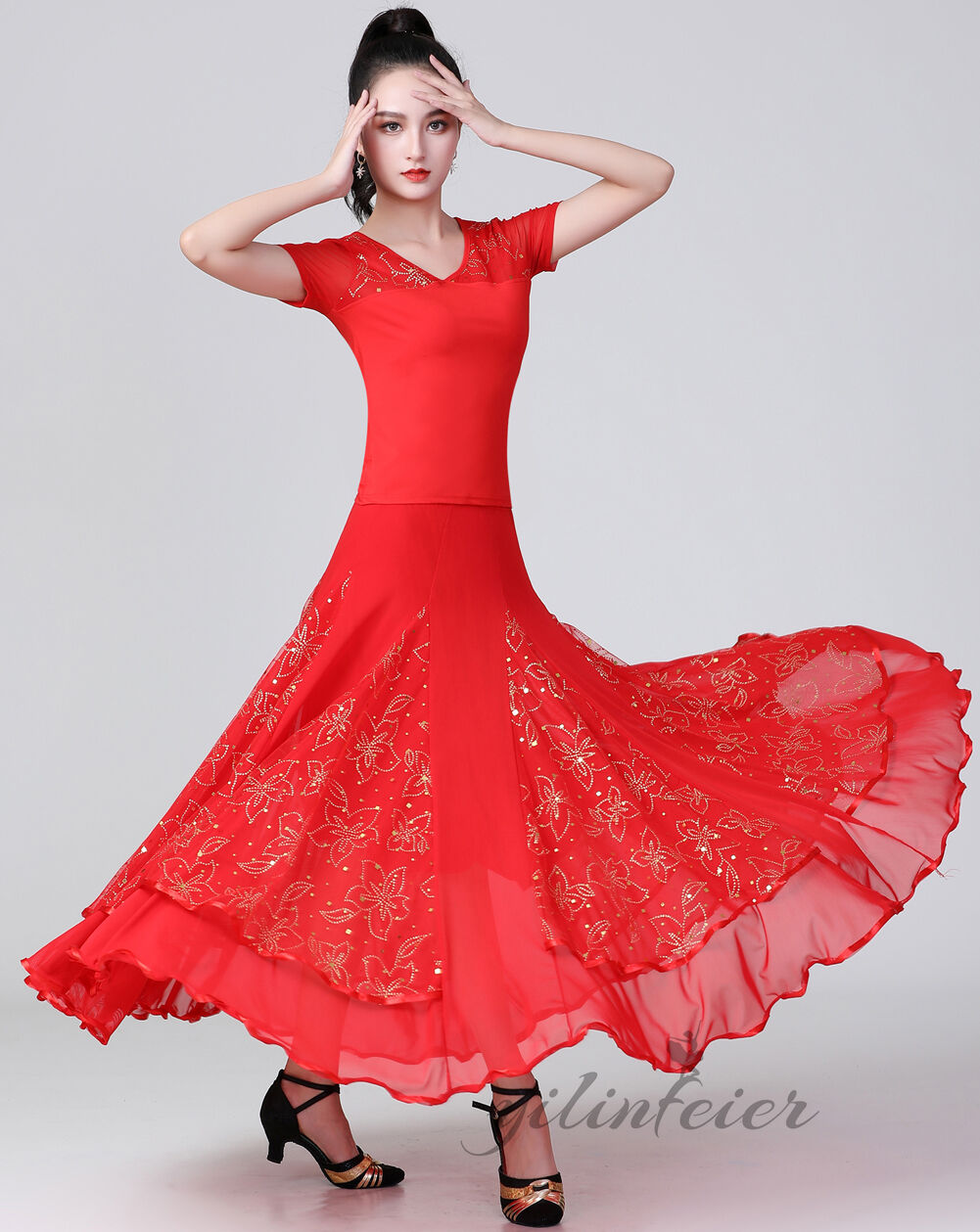 4XL/バスト98cm 上着丈59cm ウエスト68-106cm スカート丈90cm特微 着た時・歩いた時のシルエットがとても美しい。軽くてフレアもたっぷり入っているので綺麗に揺れます。ストレッチ素材で動きやすく、練習等におすすめのレディース社交ダンスウェアです特微 デザインが上品で、工芸が細かくて、本当の上品です。