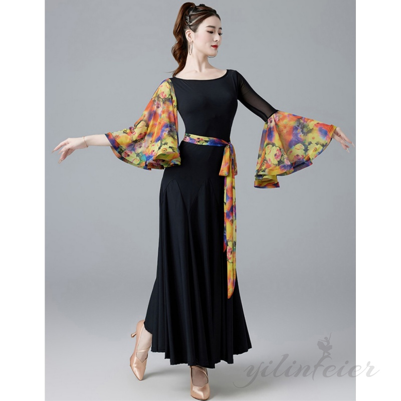 着丈は118cmとなっており、スタンダードなモダンダンスに最適です。黒を基調としたボディはどんな場面でもシックに決まり、カラフルな袖がアクセントとなっており、視覚的にも魅力的です。レッスン着としてはもちろん、パフォーマンスや競技会でもその美しさを存分に発揮できるでしょう。
