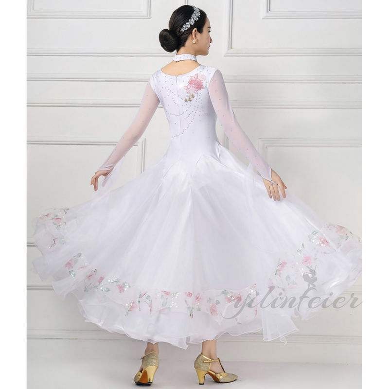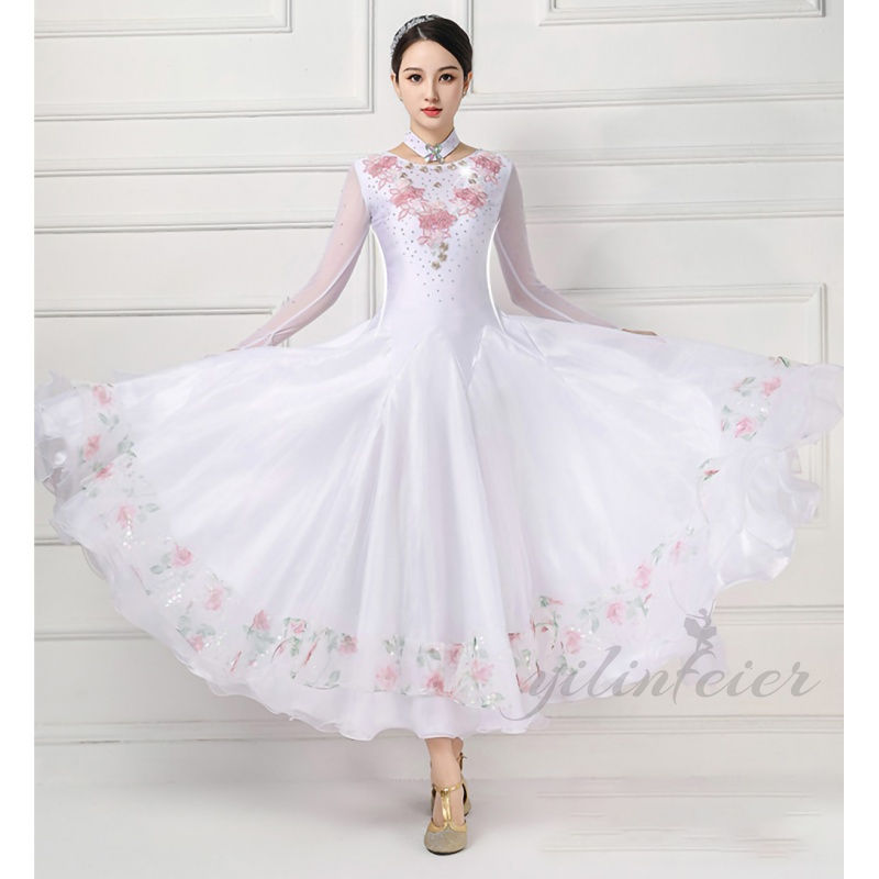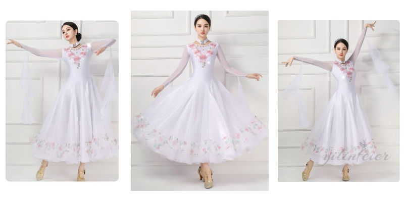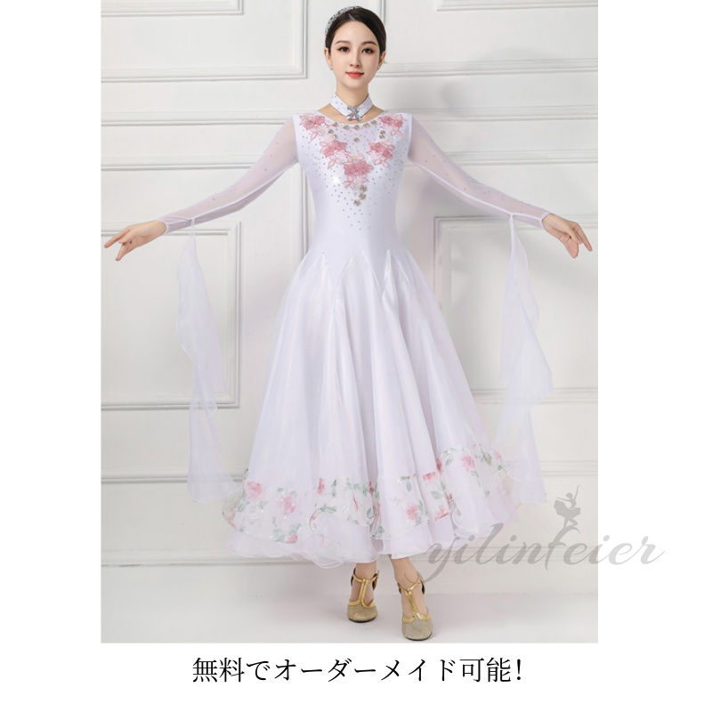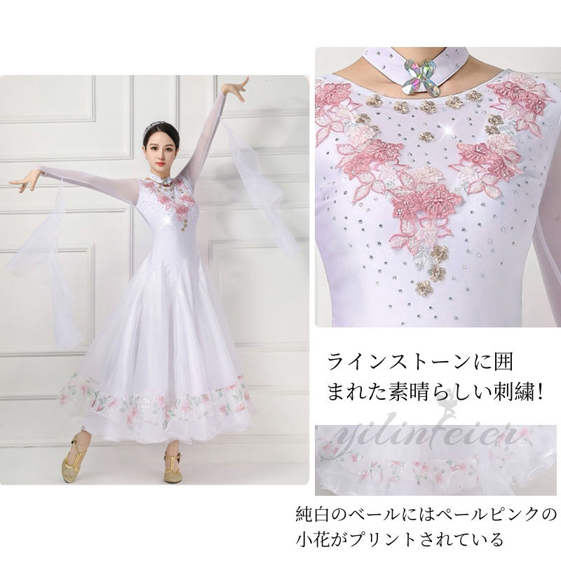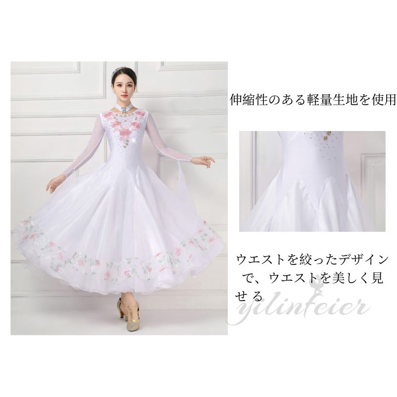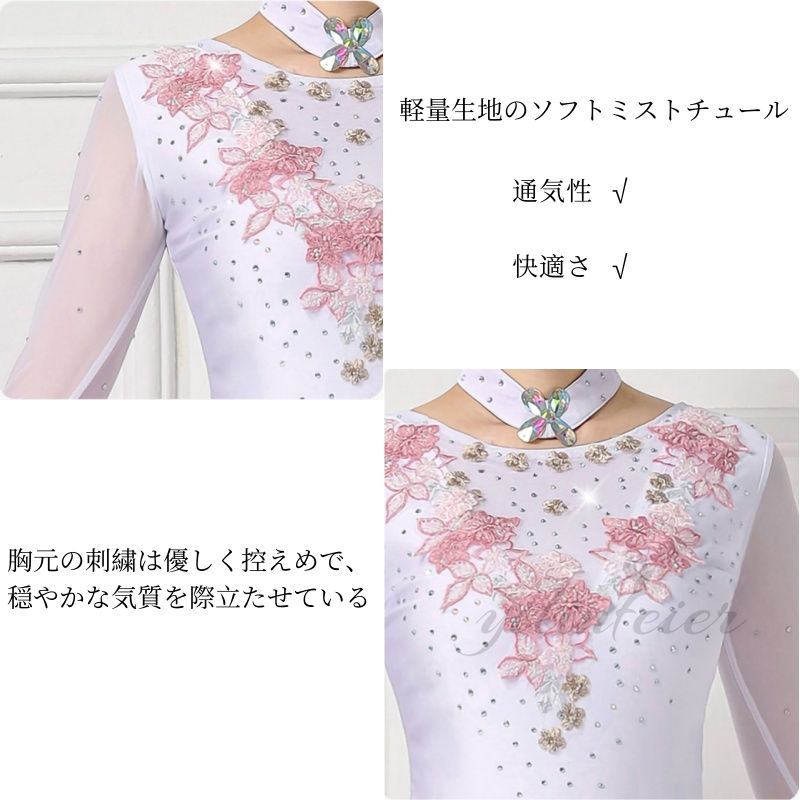 社交ダンスドレスの魅力を存分に引き出す、このモダンダンス衣装は、あらゆるダンスシーンで輝きを放ちます。白色の基調に繊細な花柄が施されたデザインは、エレガントで洗練された印象を与え、ダンサーの優雅な動きを美しく演出します。特にウエスト部分は絞り込まれたデザインで、スタイルをより美しく見せる工夫がされています。
