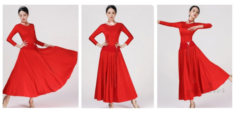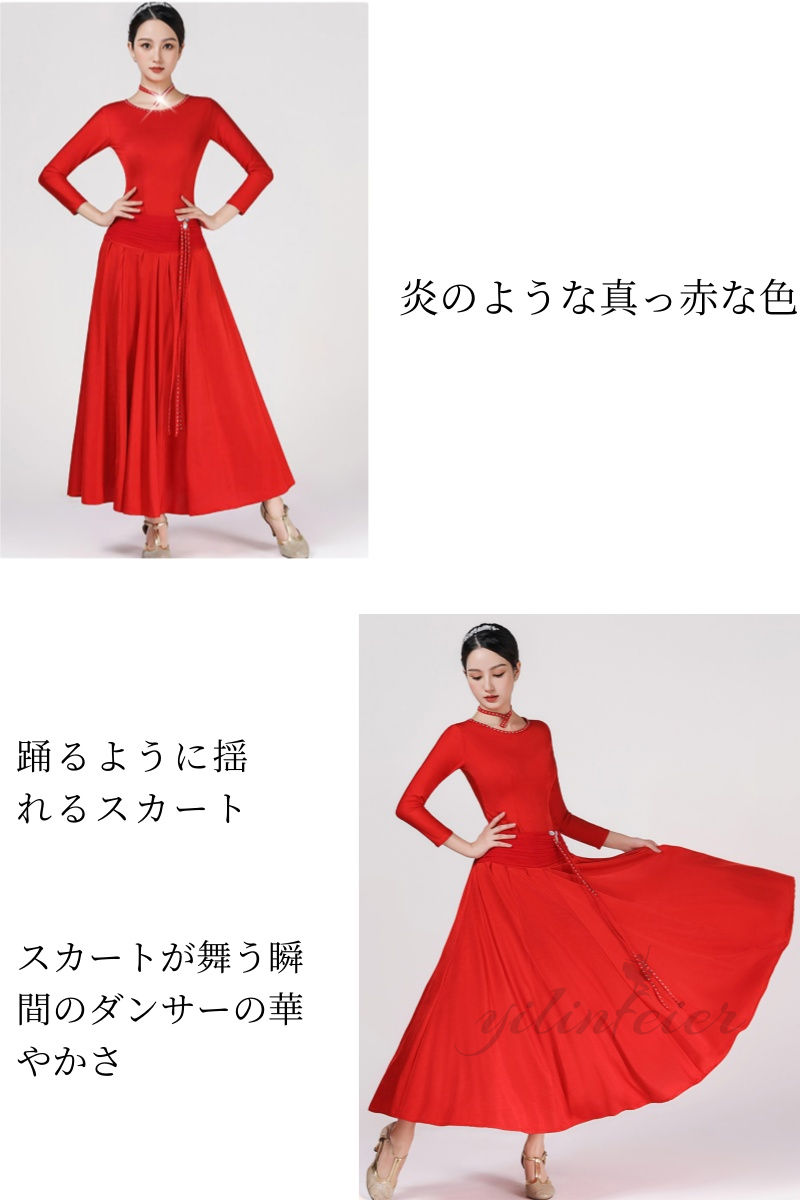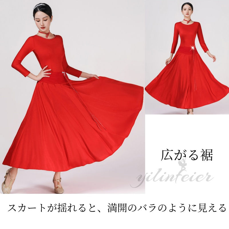 社交ダンス練習着ドレスは、その通気性と伸縮性に優れた素材で、長時間のレッスンや練習に最適です。鮮やかな赤色のこのドレスは、モダンダンスやスタンダードダンス、フラメンコなど、様々なダンススタイルに対応する多用途性を持っています。特に注目すべきは、動きに合わせて美しく広がる720度の裾です。この裾は、ダンス中のあらゆる動きを華麗に演出し、視覚的な魅力を高めます。