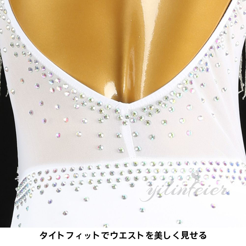 フリンジスカートは、ダンスの各ステップで美しく波打ち、観客の目を引きつけること間違いなしです。発表会や競技会、練習やデモ演出にも最適で、どのような場面でもその存在感を放ちます。高級感あふれるデザインで、あなたのダンスを一層引き立てるこのドレスは、特別な日のためにぜひとも手に入れたいアイテムです。