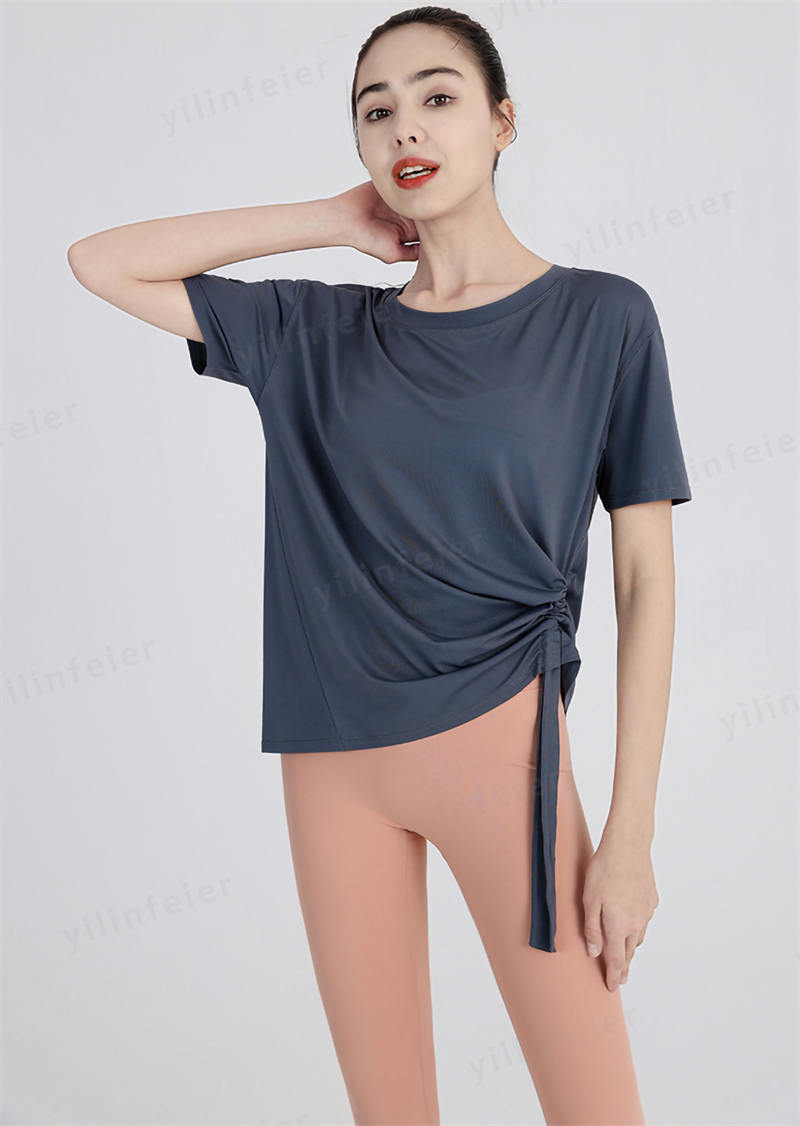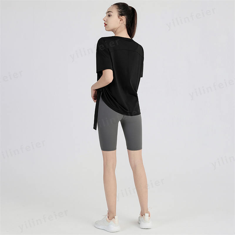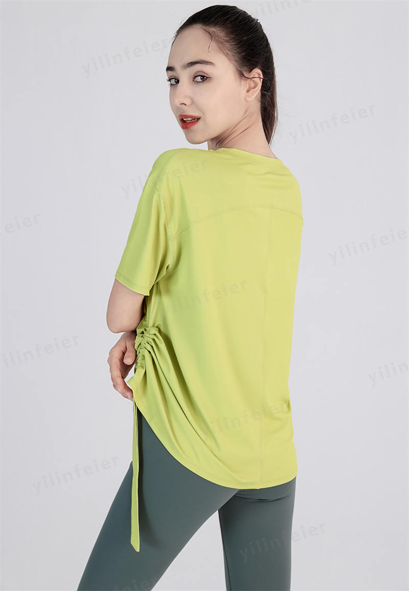 お尻をカバーしつつ背中が見えてセクシーかつ、トレーニングに適しています。ヨガの時はウエストを結び、エアロビクスの時は垂らして、動きに合った可愛いスタイルで使用しています