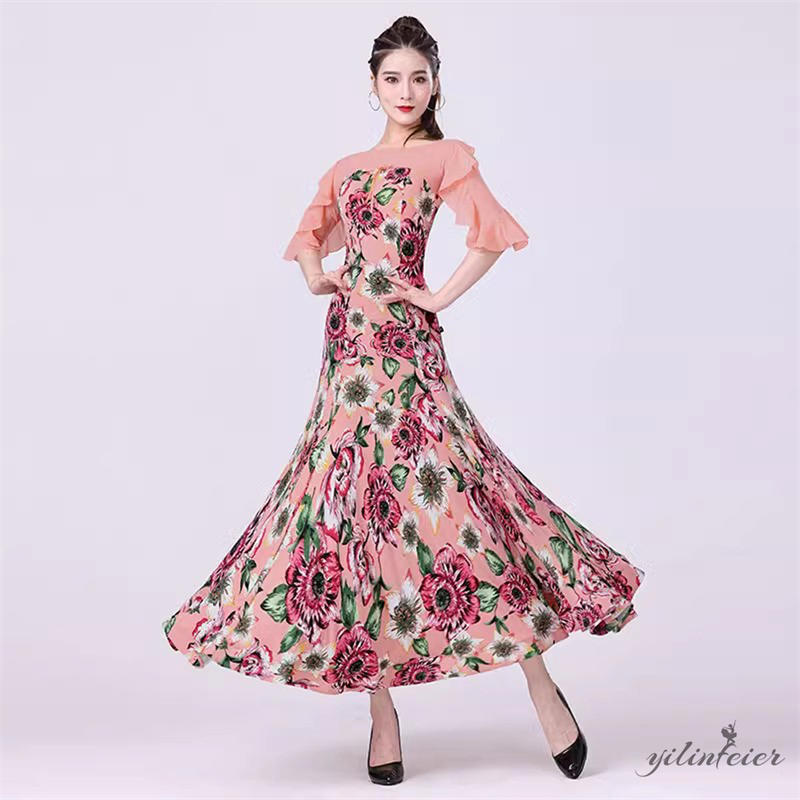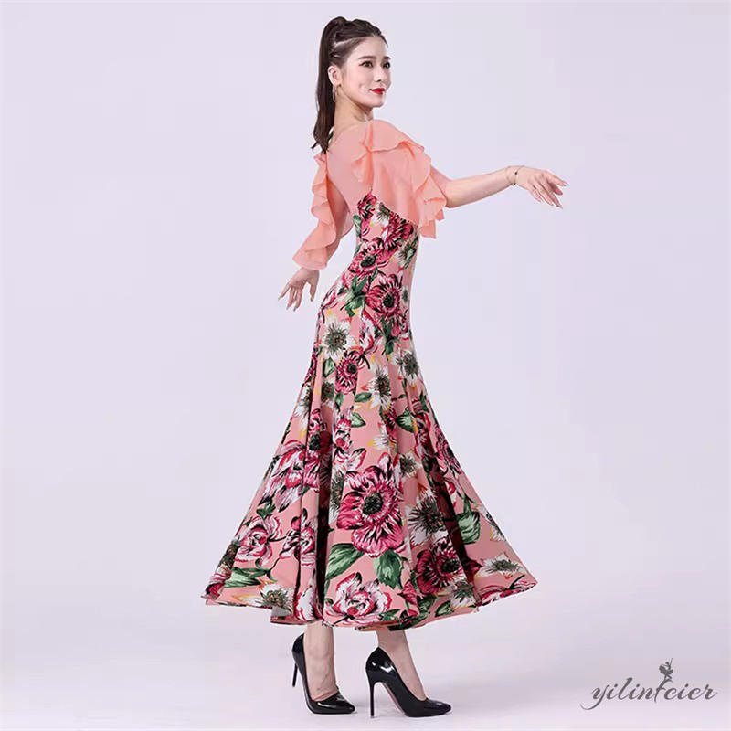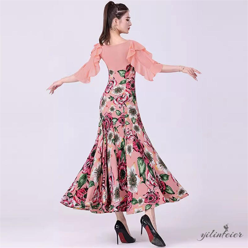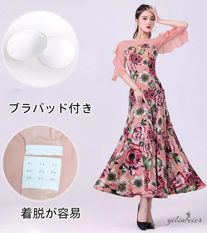 社交ダンス レディース ピンク花柄 フリル袖 モダンダンス衣装 ダンスドレス ワンピース 社交ダンス衣装 広がる裾スタンダード レッスン着 競技着 演出用 高級感 踊りドレス 大人気