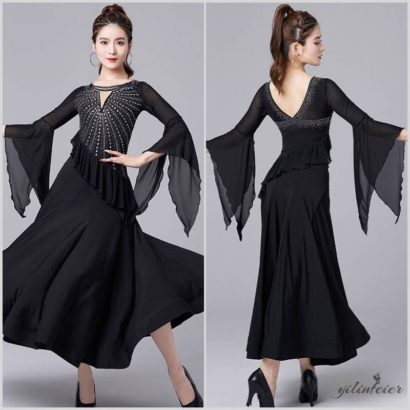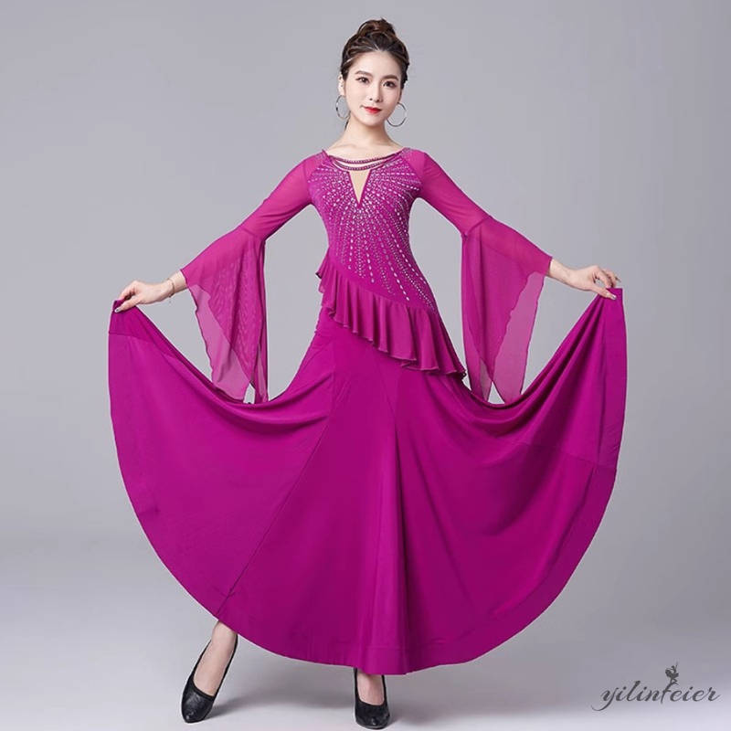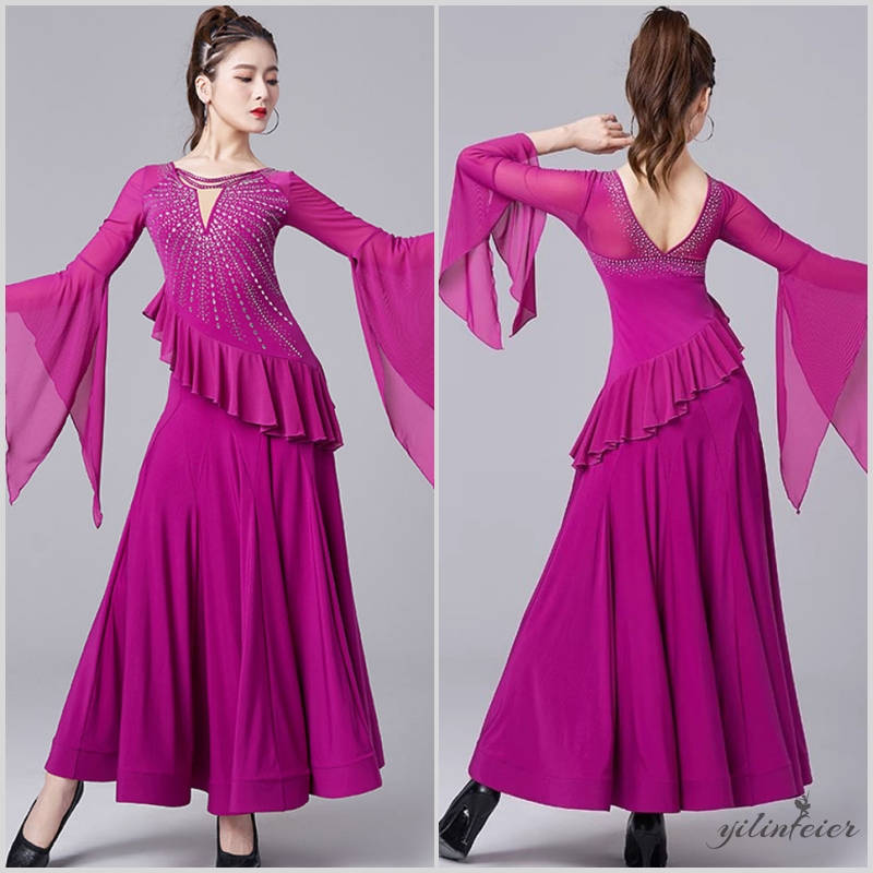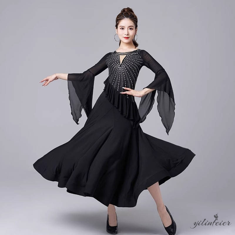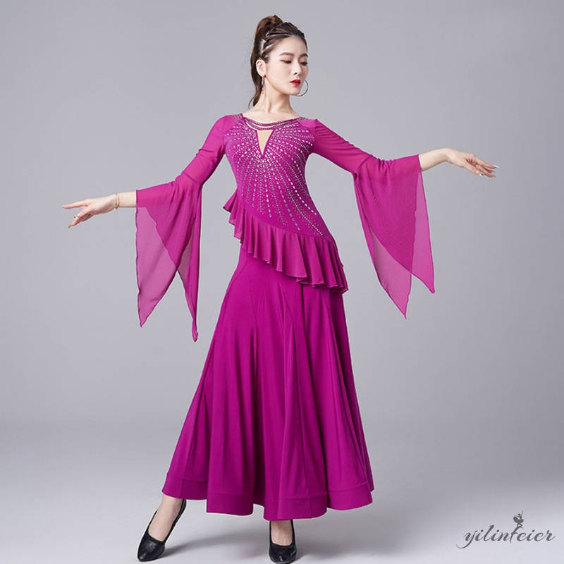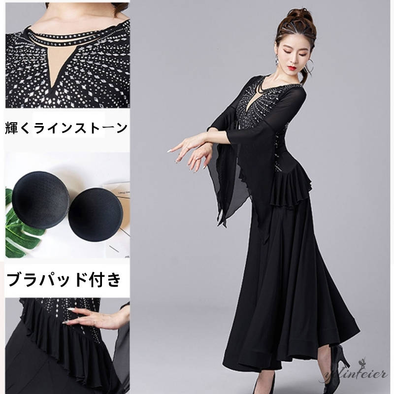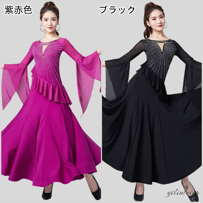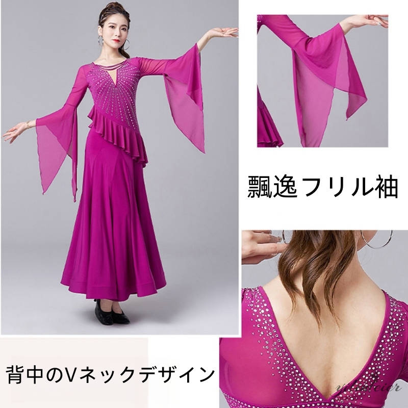 社交ダンス レディース ダンスドレス 衣装 ワルツ ワンピース 飄逸フリル袖モダンダンス衣装 社交ダンス衣装 広がる裾スタンダード レッスン着 競技着 演出用 高級感 踊りドレス 大人気