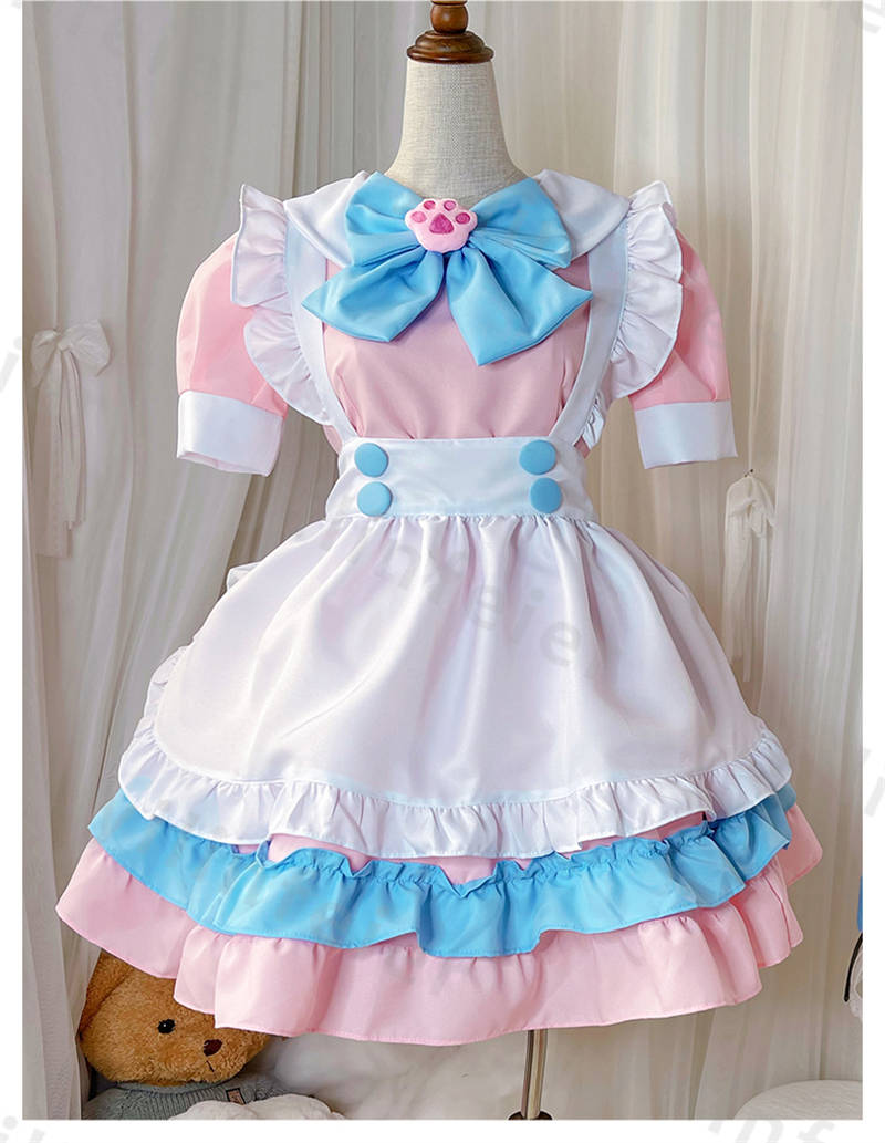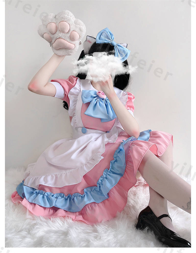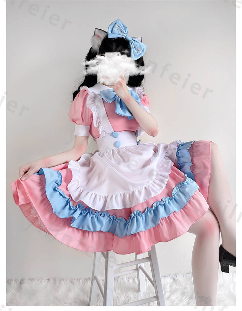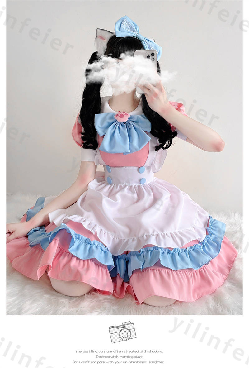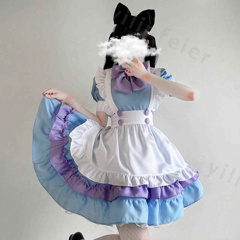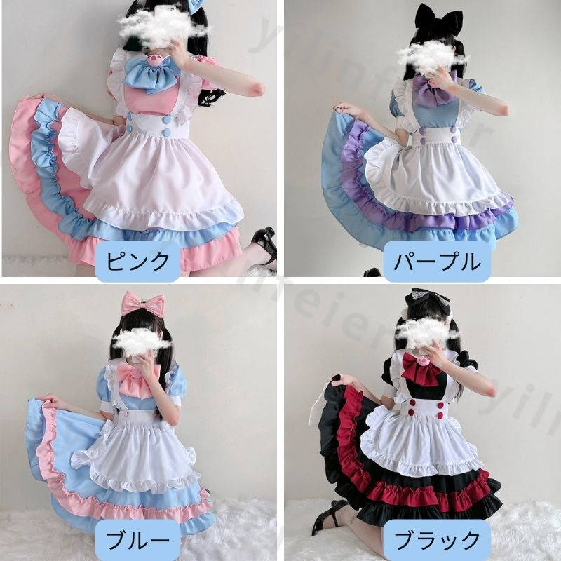 商品内容 ワンピース+エプロン+蝶結び+頭飾り材質 ポリエステルなどカラー ピンク、ブルー、パープル、ブラック