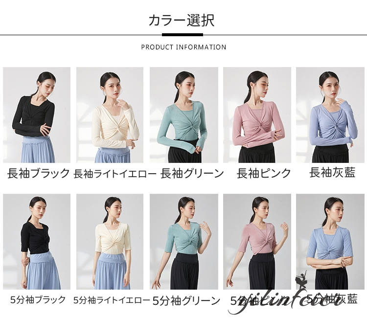 色:長袖ブラック、長袖ライトイエロー、長袖灰藍、長袖グリーン、長袖ピンク、5分袖ブラック、5分袖ライトイエロー、5分袖灰藍、5分袖グリーン、5分袖ピンク