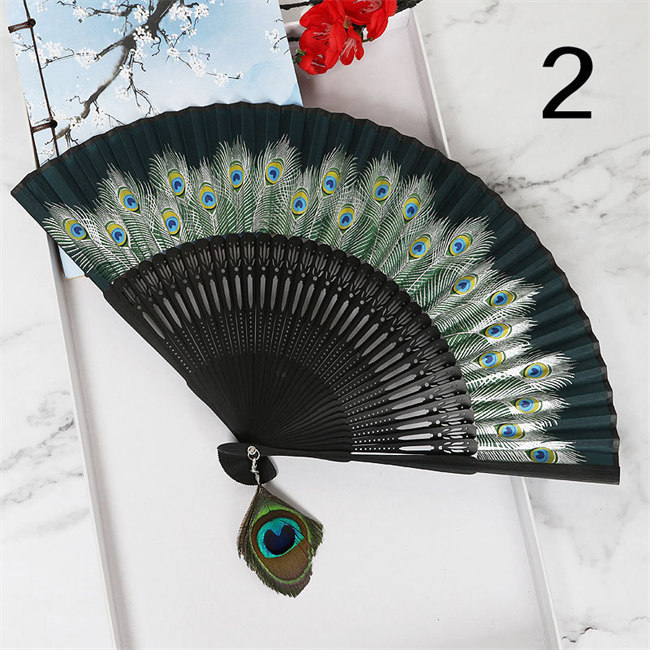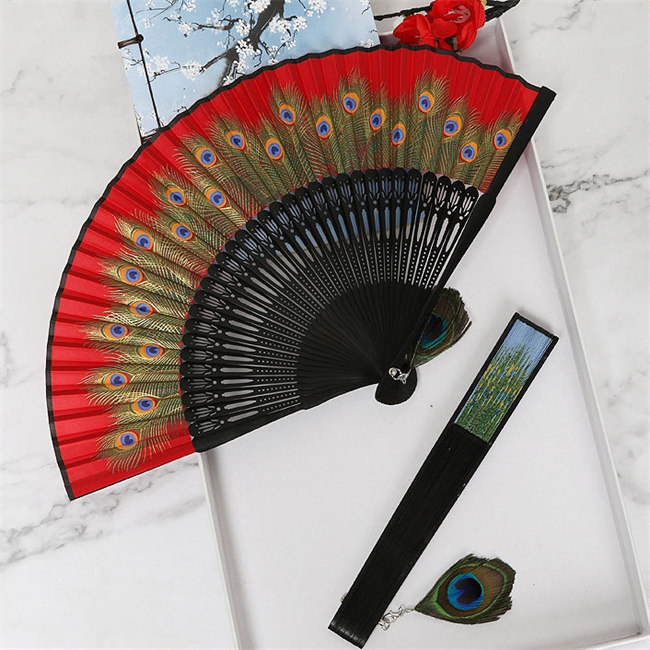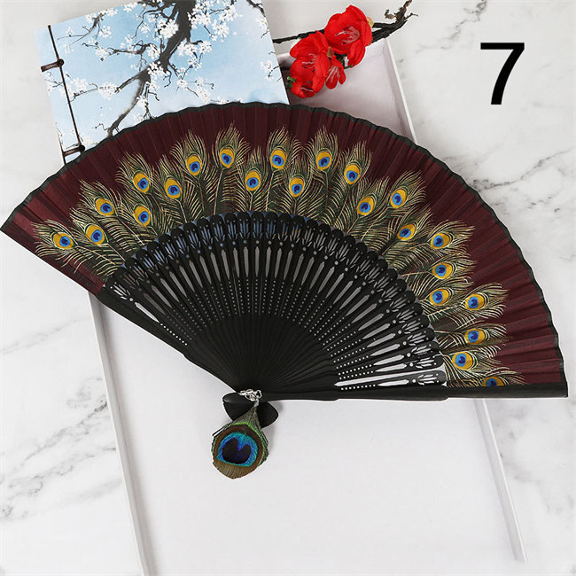 8色展開竹製扇子 絹製練習クジャク柄ダ
