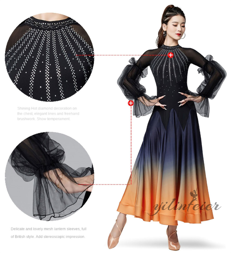 社交ダンス レディース ダンスドレス 衣装 ワンピース レースフリル袖 モダンダンス衣装 社交ダンス衣装 広がる裾スタンダード レッスン着 競技着 演出用 高級感 踊りドレス 大人気