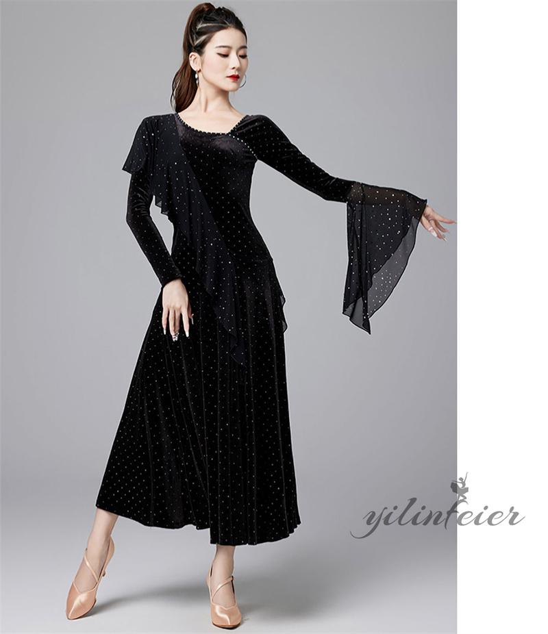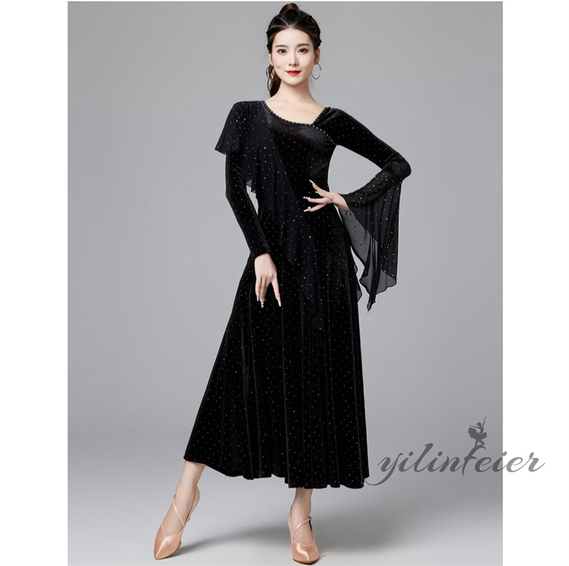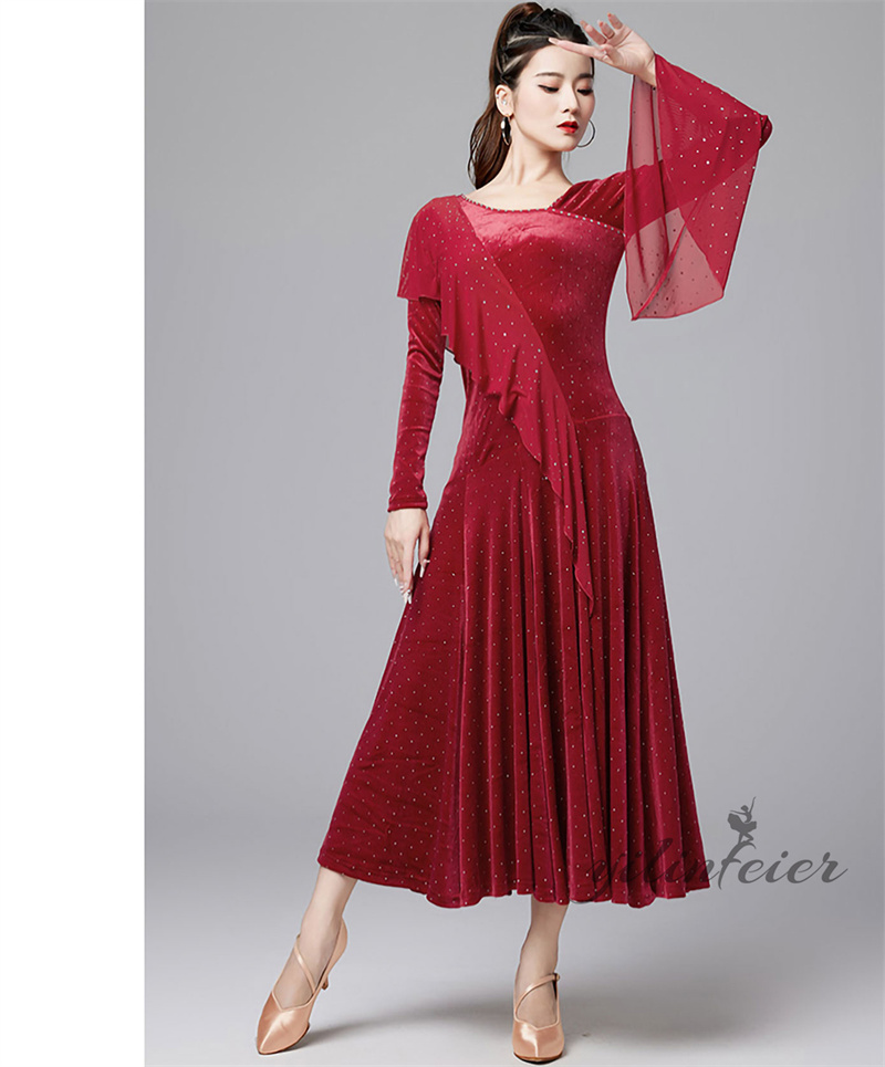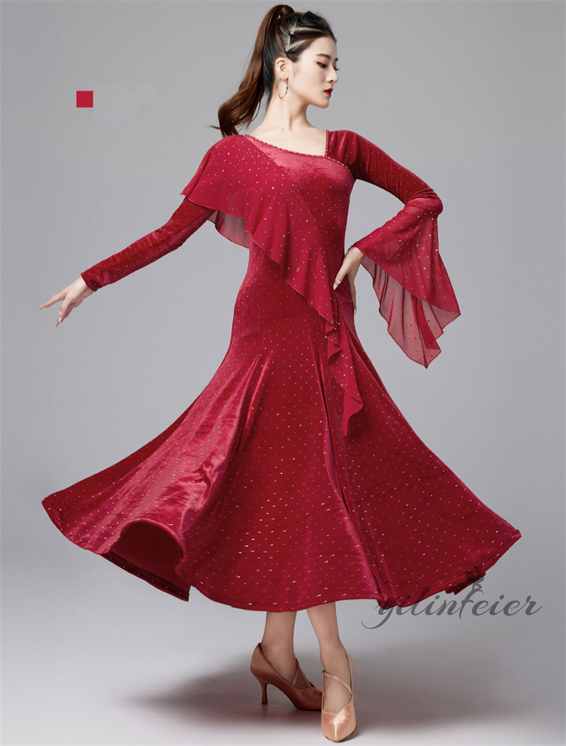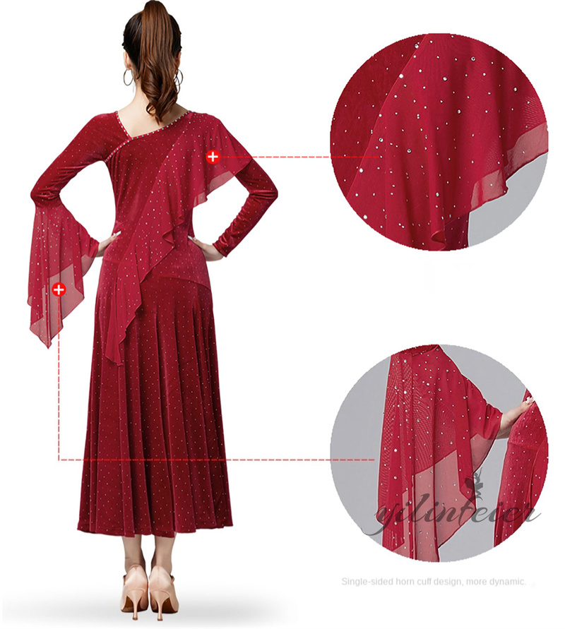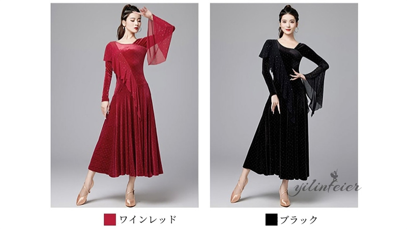 社交ダンス レディース ダンスドレス 衣装 ワンピース レースフリル袖 モダンダンス衣装 社交ダンス衣装 広がる裾スタンダード レッスン着 競技着 演出用 高級感 踊りドレス 大人気