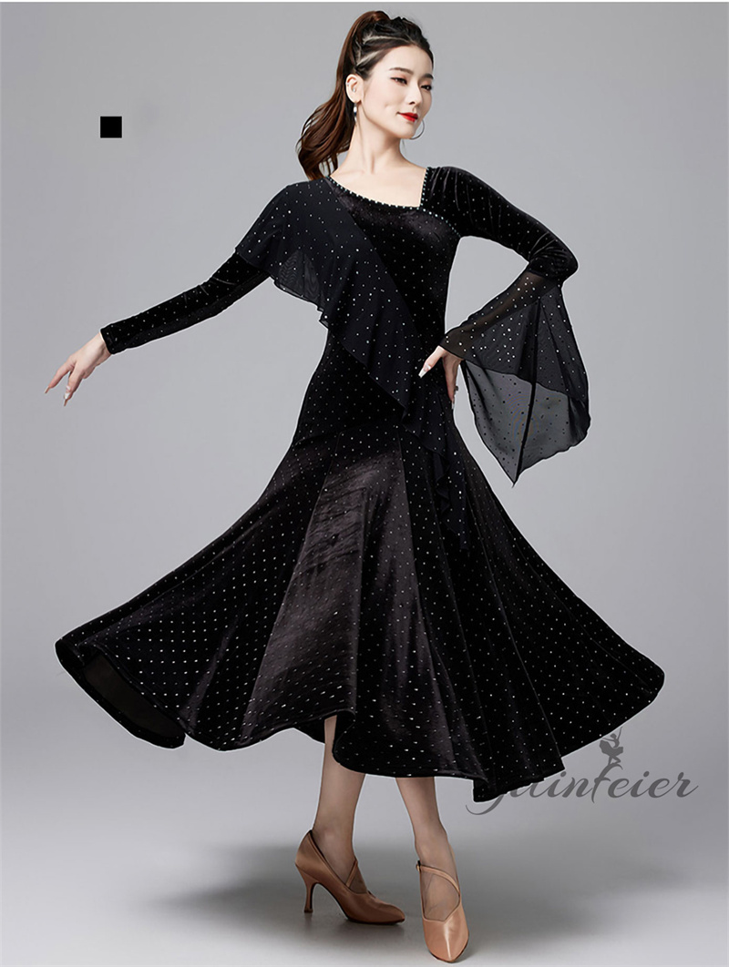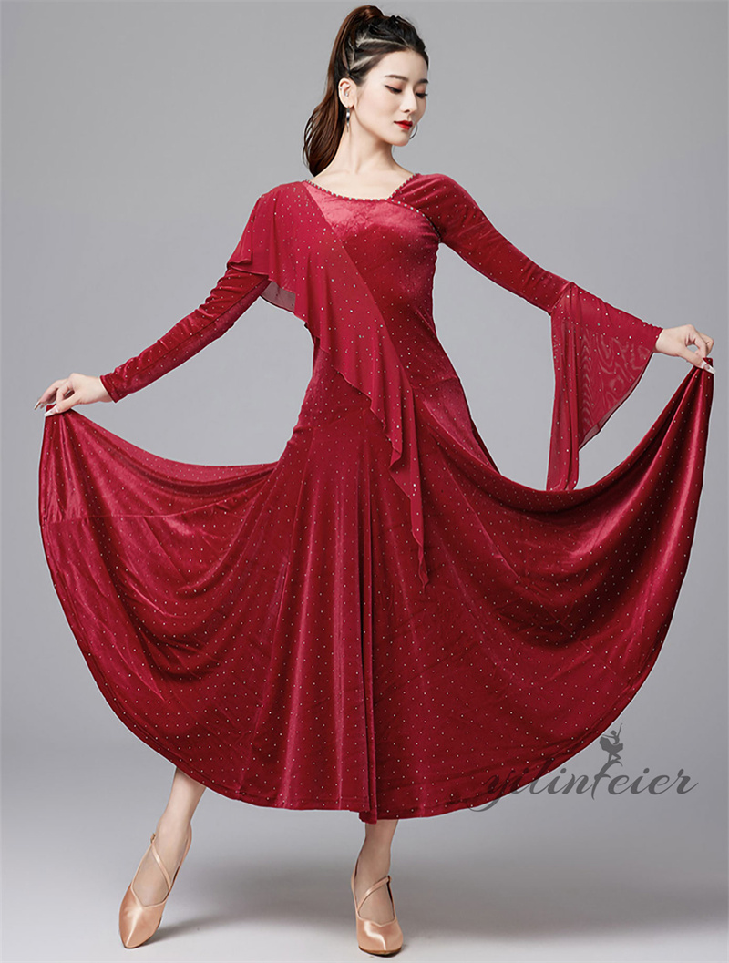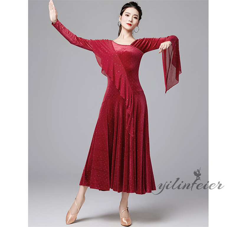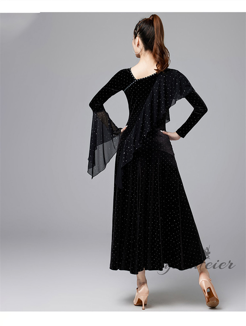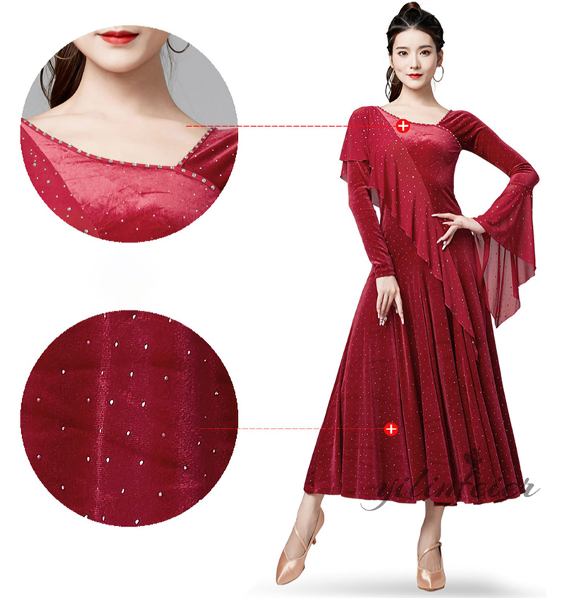 社交ダンス レディース ダンスドレス 衣装 ワンピース レースフリル袖 モダンダンス衣装 社交ダンス衣装 広がる裾スタンダード レッスン着 競技着 演出用 高級感 踊りドレス 大人気