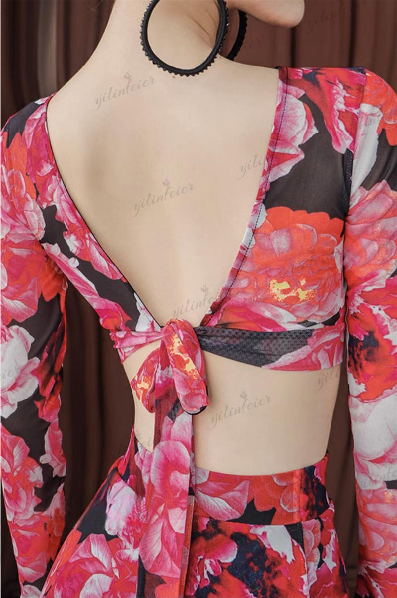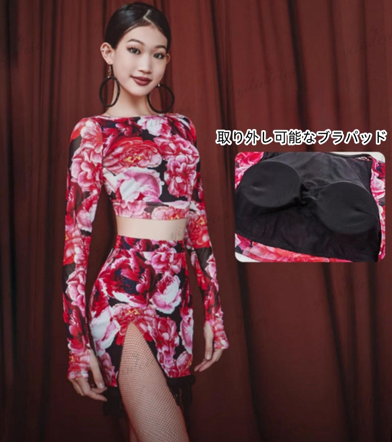 長袖 お花柄 ラテンダンス 痩せラテン衣装 発表会用ドレス ワルツ ラテン系 ダンスドレス ワルツ用 発表会用 競技ダンス イベント テン専用ドレス レッスン着 練習用 ラテンドレス