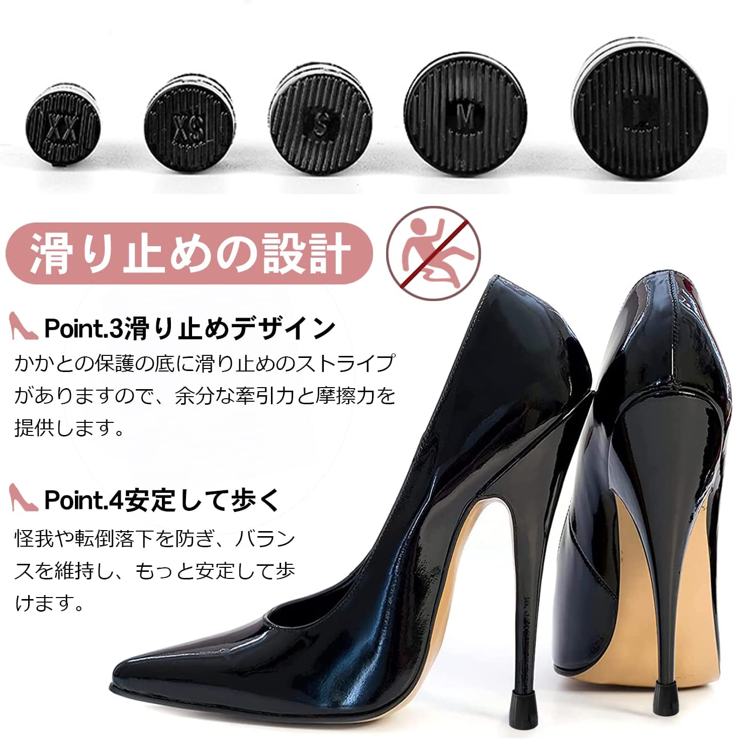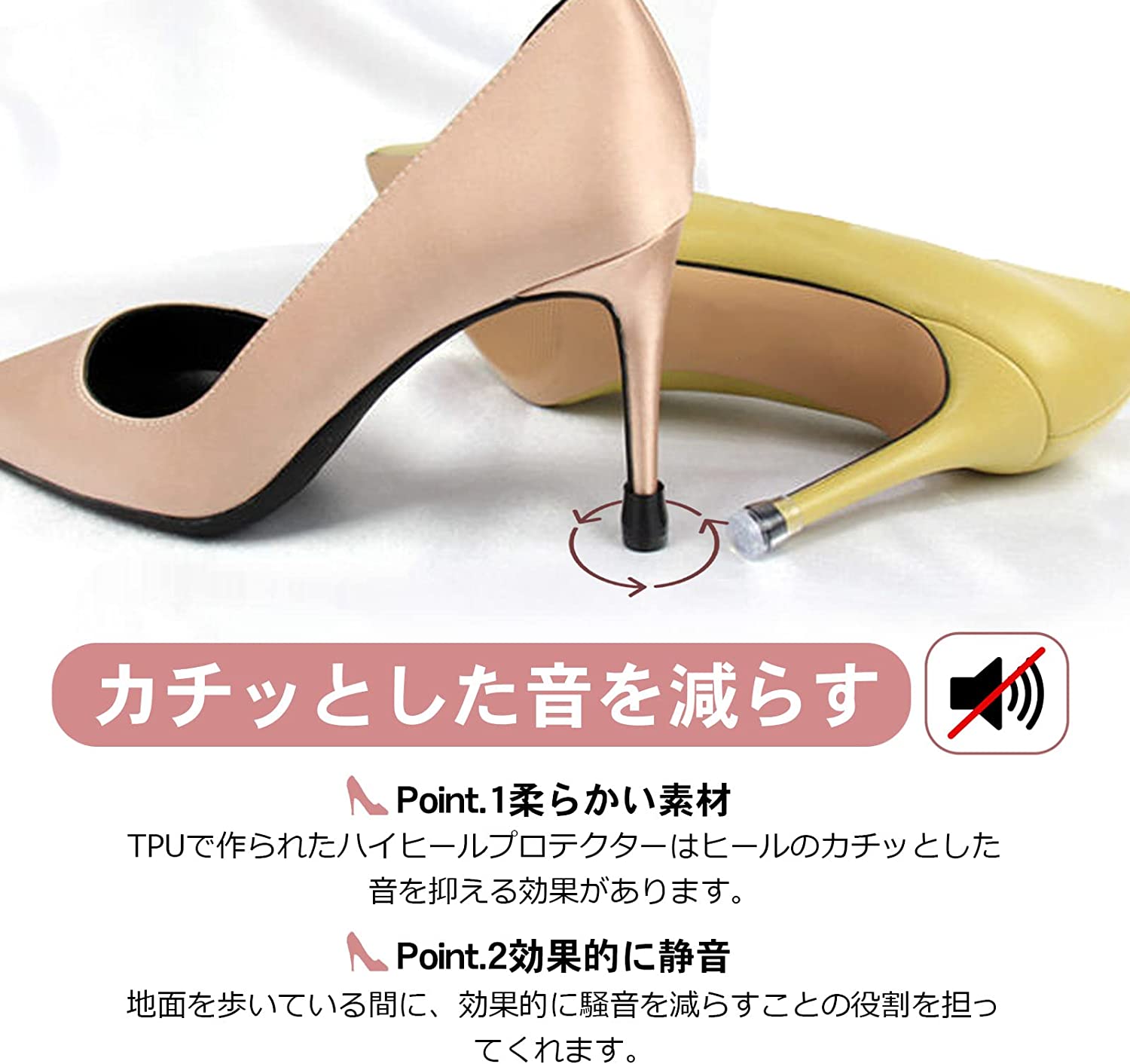 "【静音 &ハイヒールのかかとの摩耗防止】 TPUで作られたハイヒールプロテクターはヒールのカチッとした音を抑える効果があります。地面を歩いている間に、効果的に騒音を減らすことの役割を担ってくれます。 &このハイヒール保護カバーを使ったら、草、泥、クラックや格子の中に沈んでことが防止でき、ハイヒールの摩耗を防ぎ、使用時間を延長することができます。また、靴の美観を損なうことなく、かかとを傷から保護します。