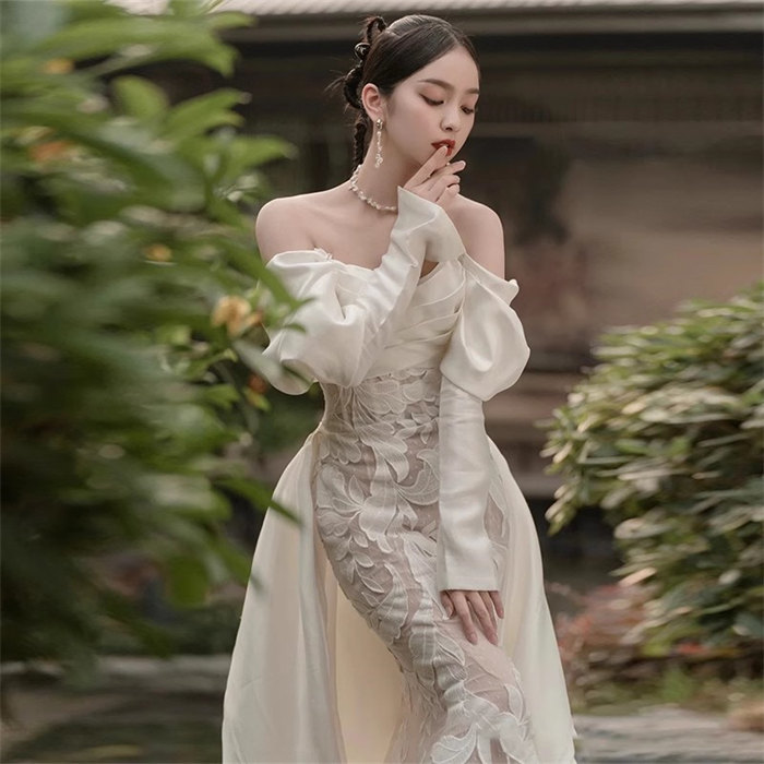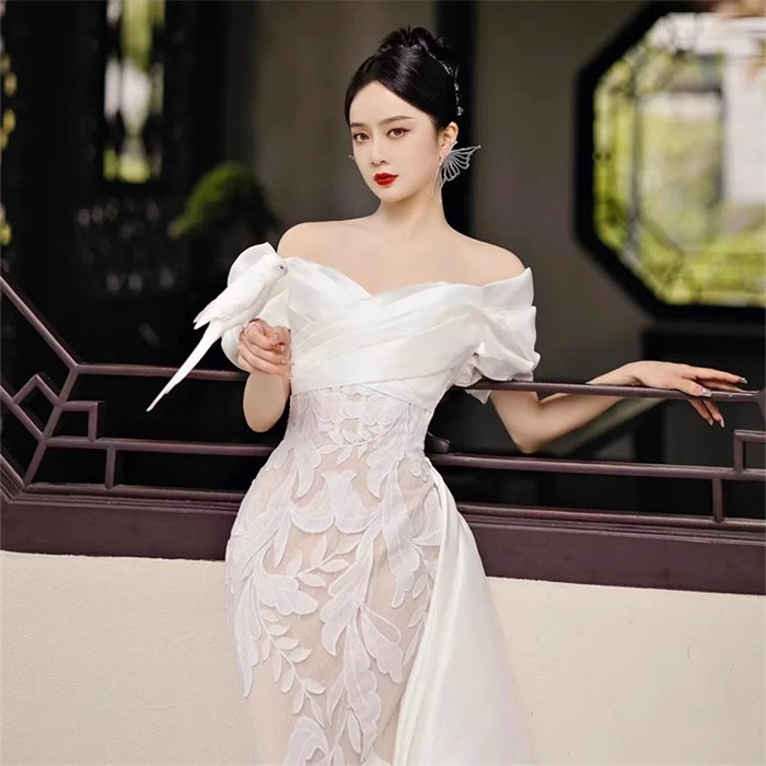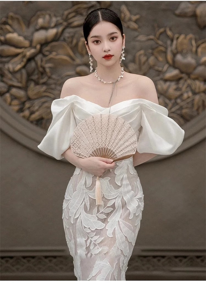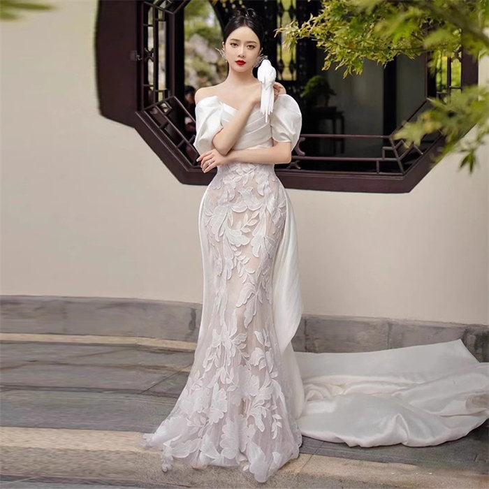 ホワイトロング ウェディングドレス オフショルダー豪華花嫁 結婚式 披露宴 フォマール ドレス シンプル Aライン ウエディング ドレス チュール 可愛い ブライド ドレス 発表会 演奏会 ドレス 前