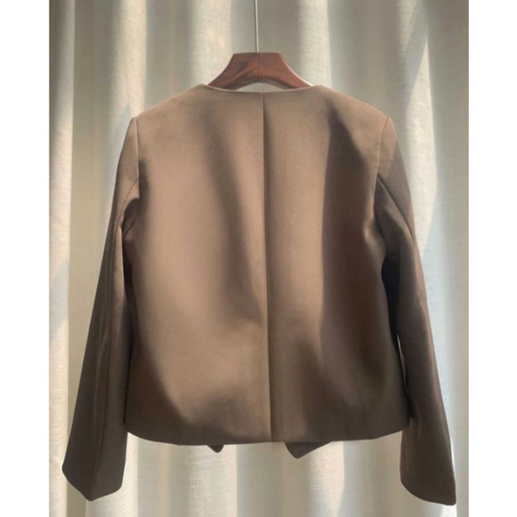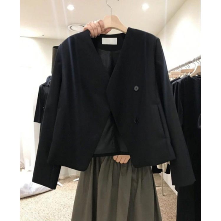 秋 通勤 ノーカラージャケット 黒 長