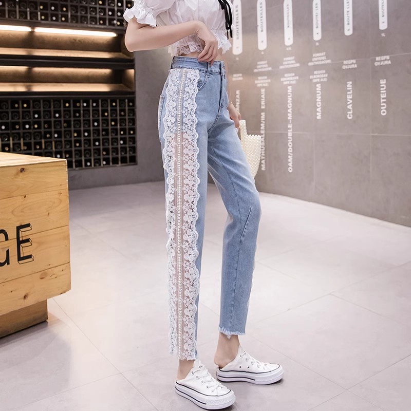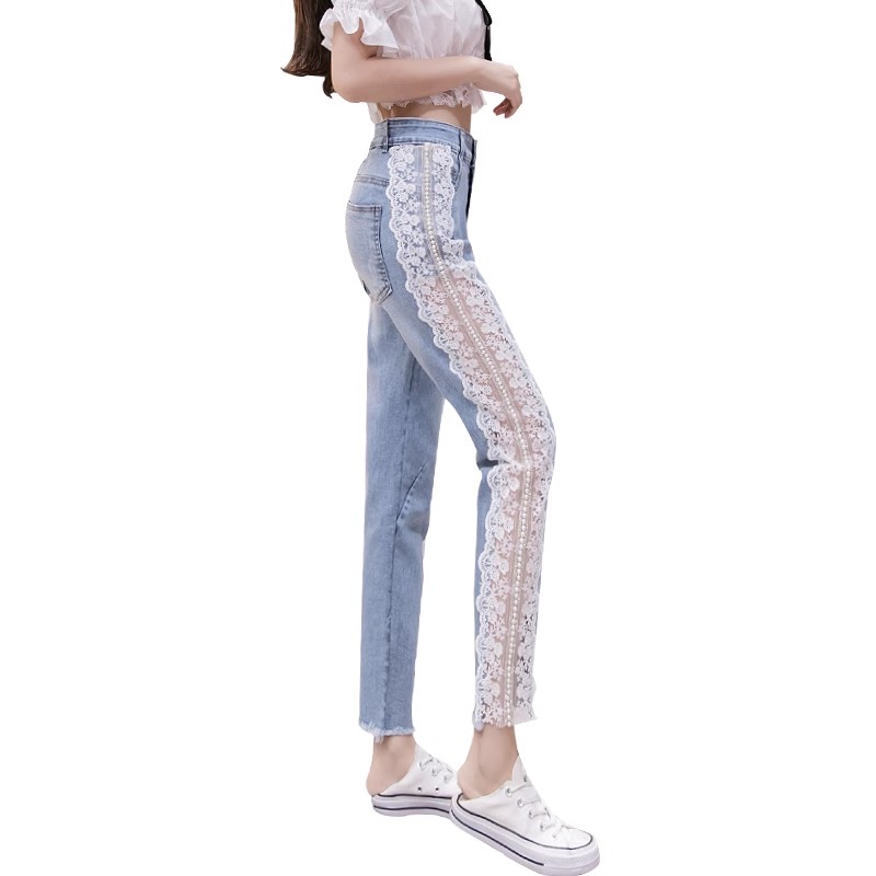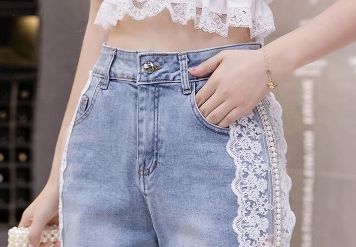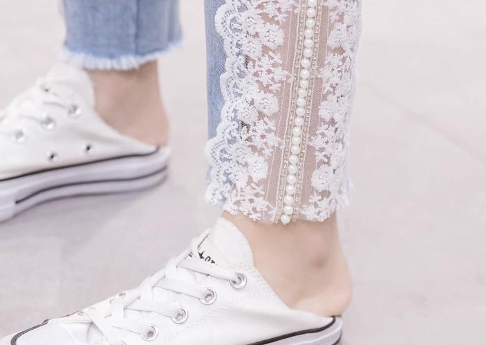 デニムパンツレース飾り パール付デニム
