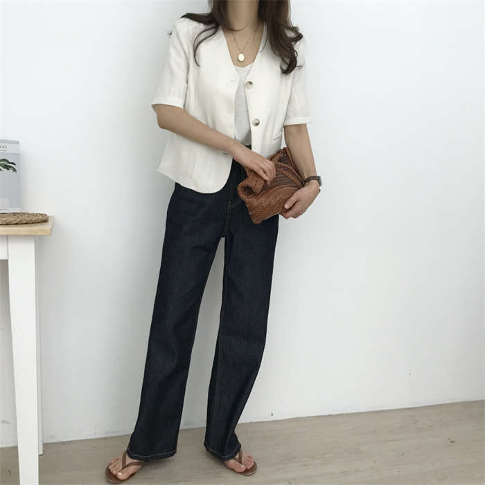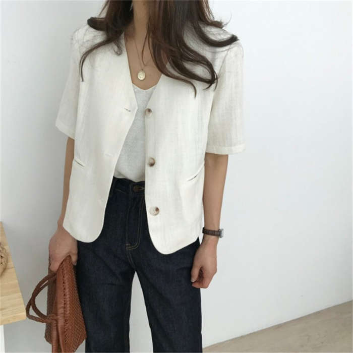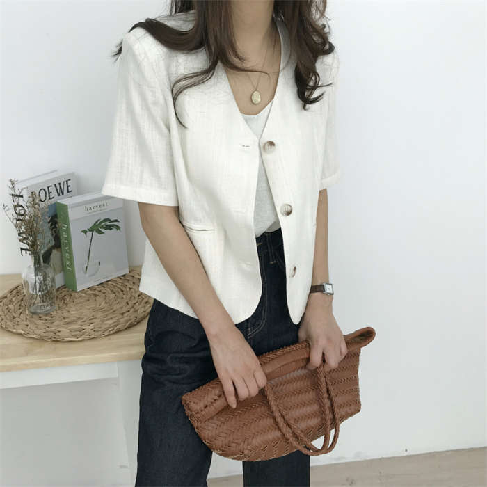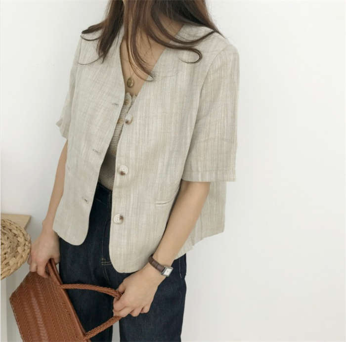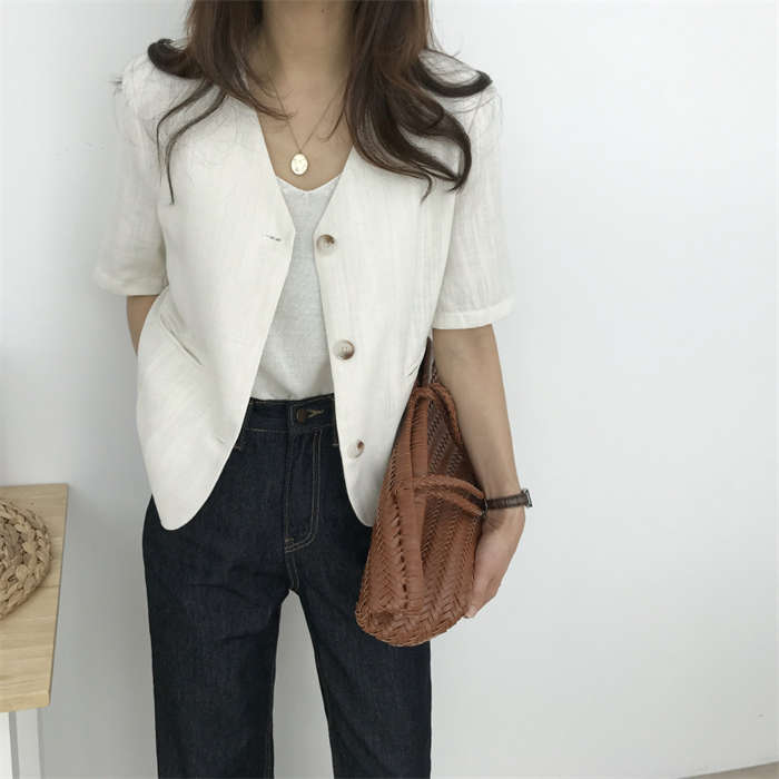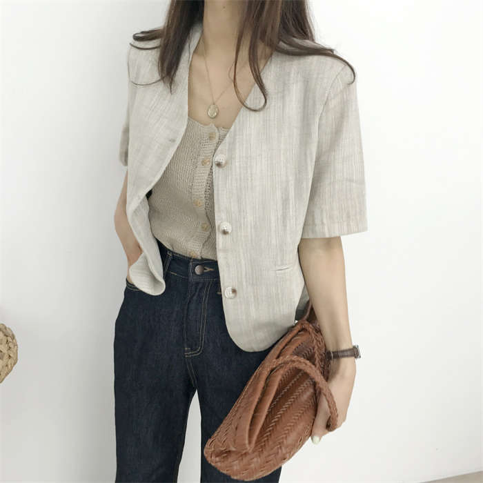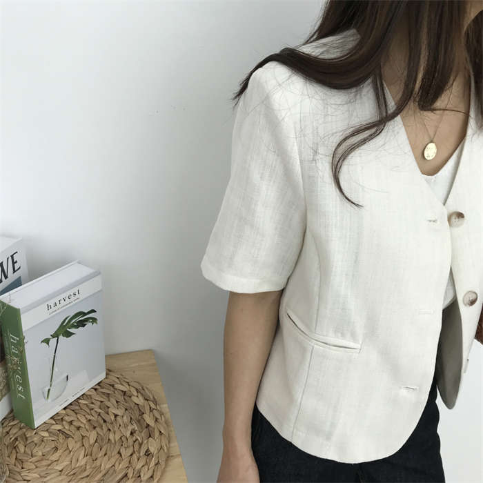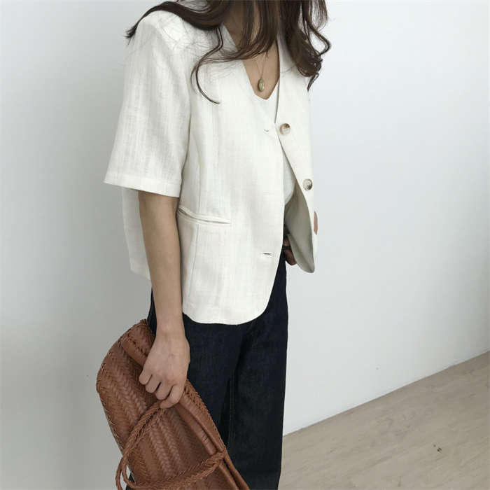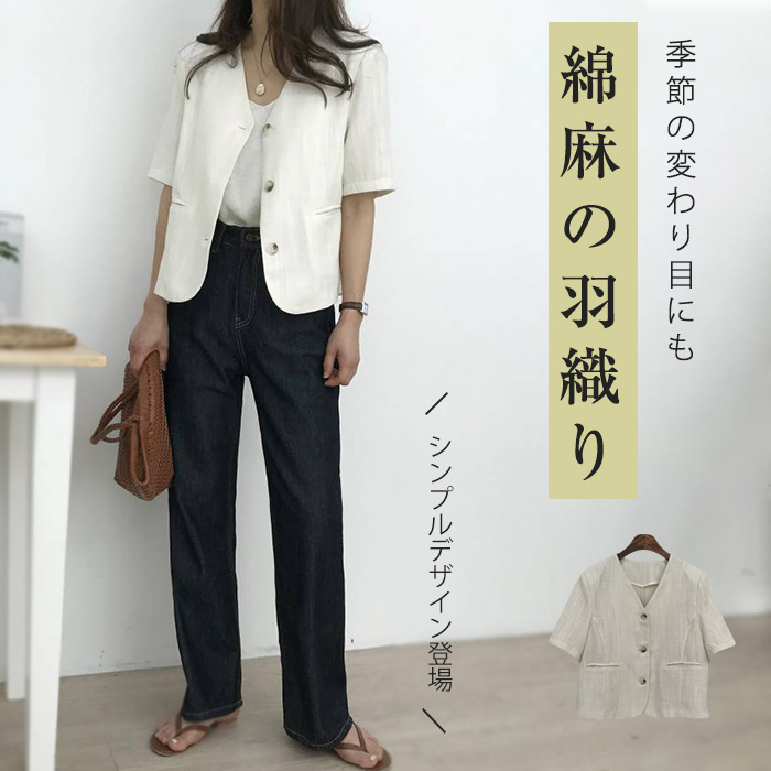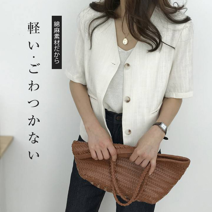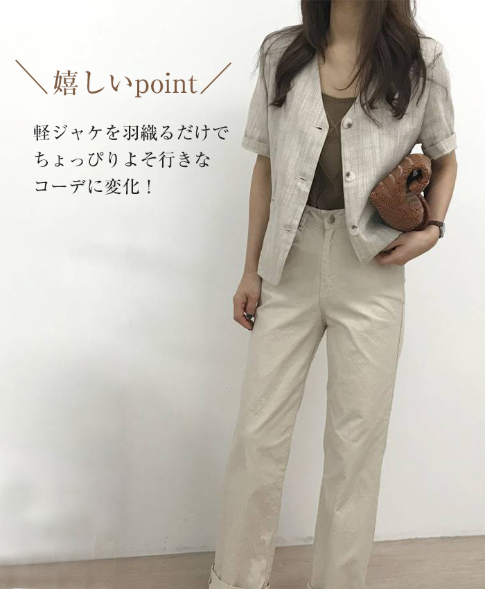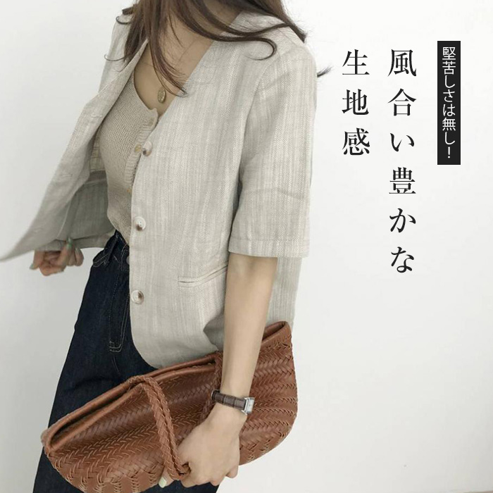 リネン風 半袖 ノーカラージャケット