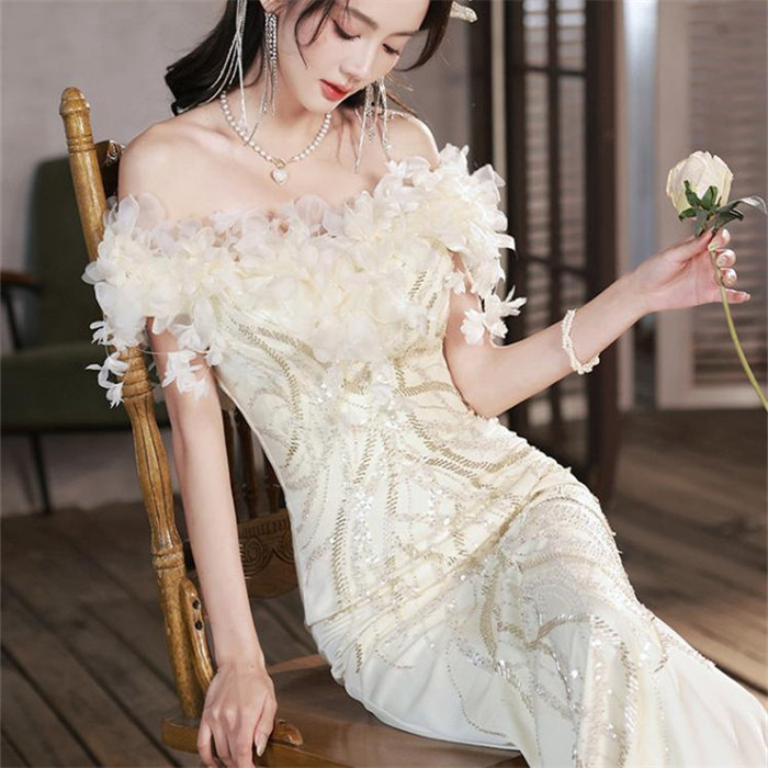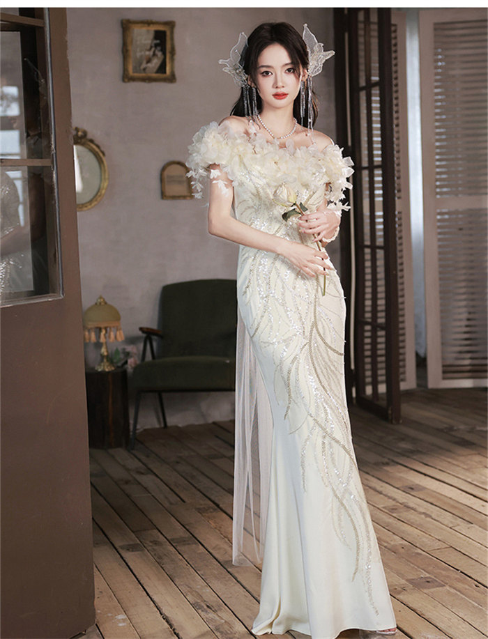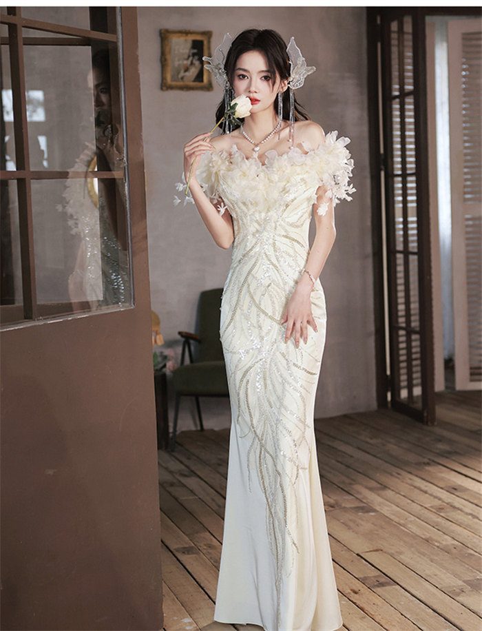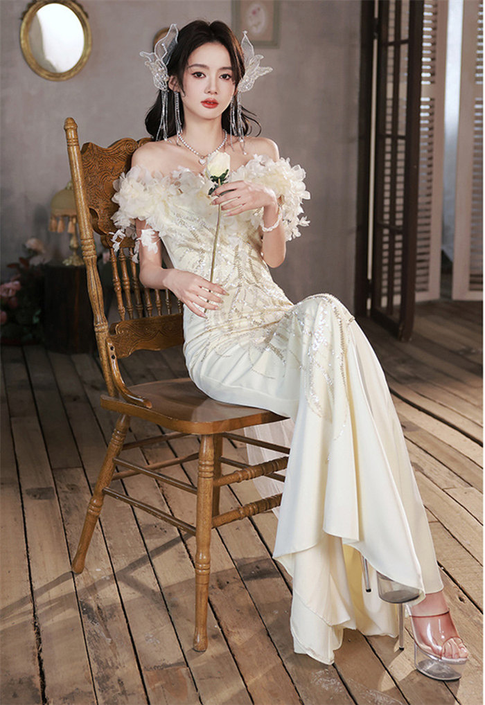 シャンパンウェディングドレスオフショル