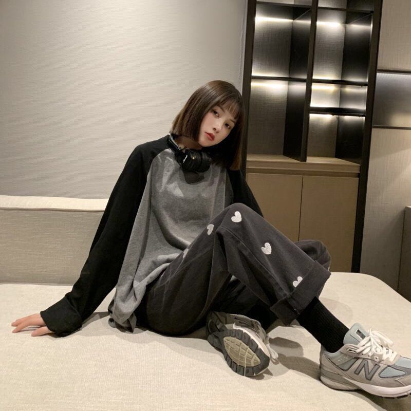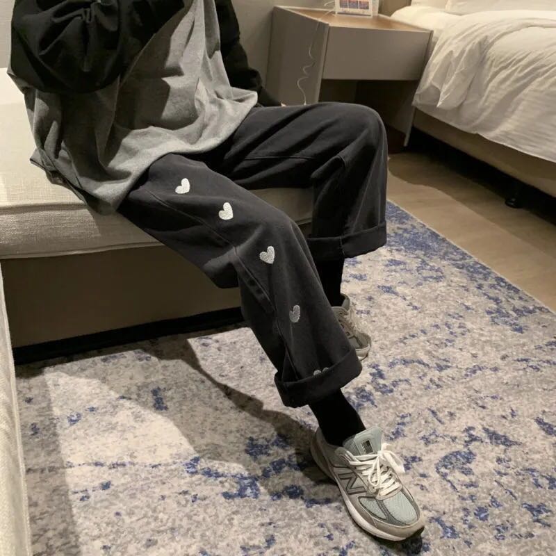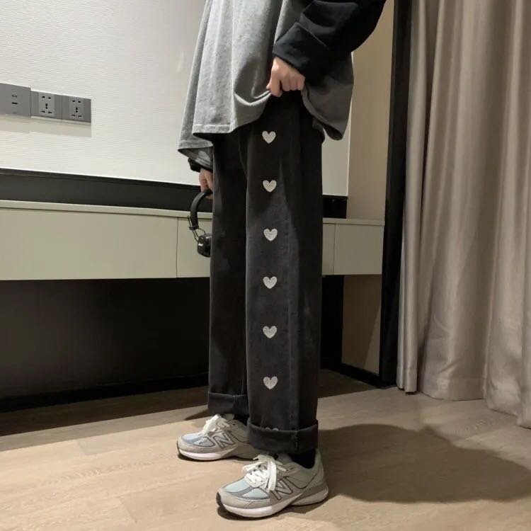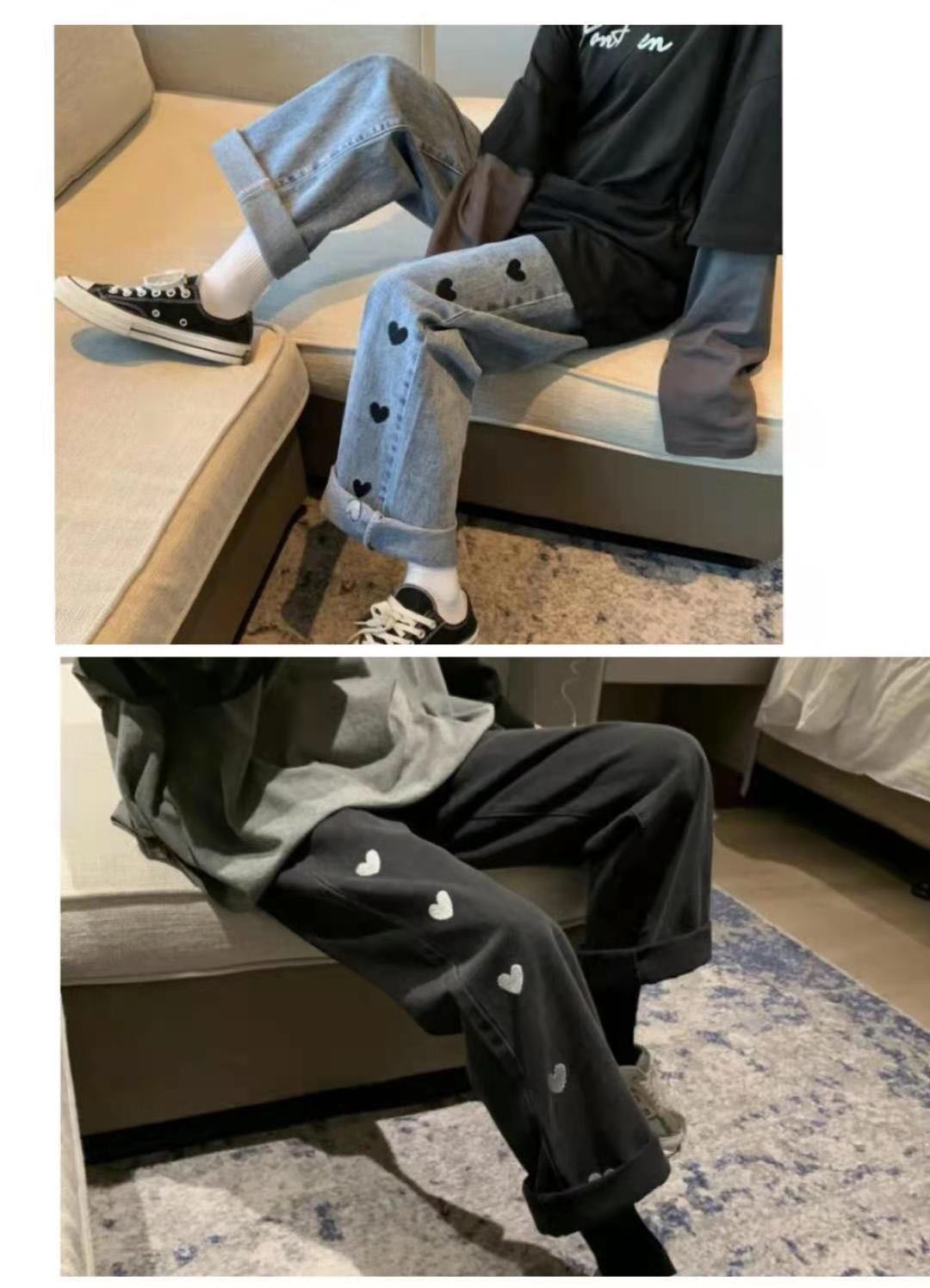 ジーンズ ワイドパンツ ハート刺繍 レ