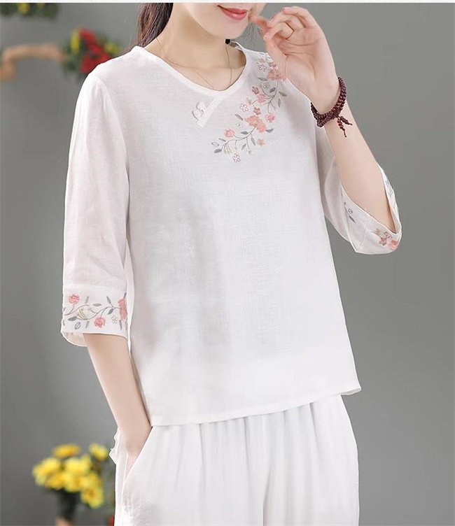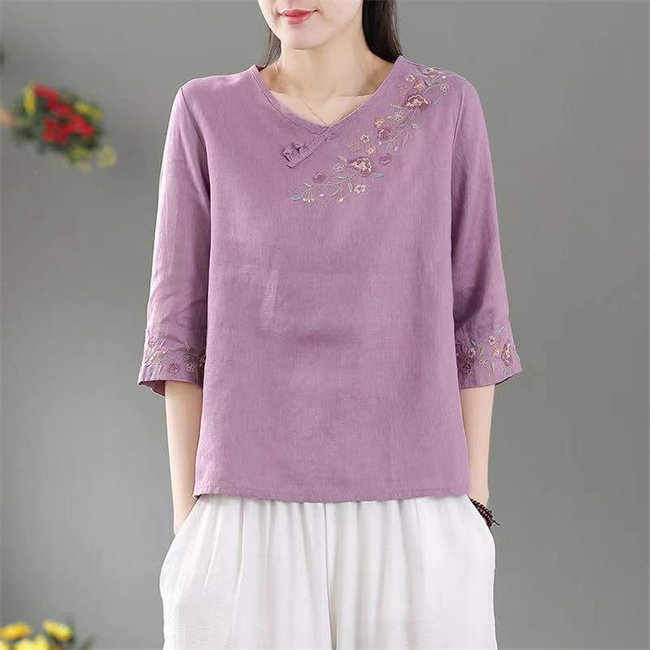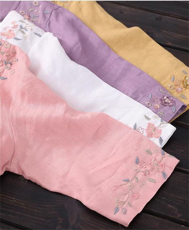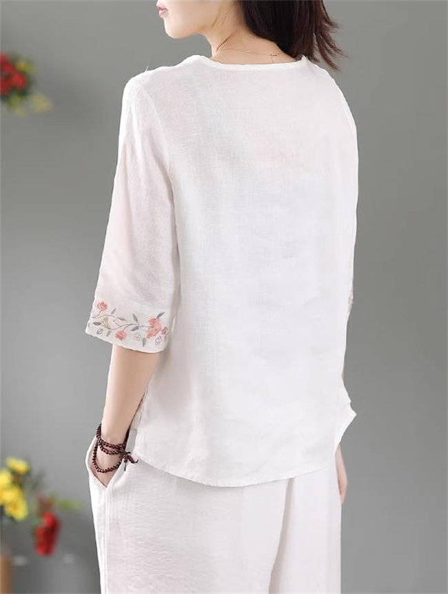 4色展開ブラウス シャツ レディース 半袖 トップス カジュアル 刺繍きれいめ おしゃれ かわいい 夏 大きめ 無地7分袖丸襟綿麻製 カジュアル フォーマル tシャツトップスレディーストップス
