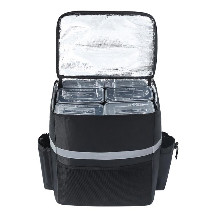上面がファスナーで開く仕様、食べ物の出し入れが便利です。使用後は折りたためます、省スペース。パックの前面と側面の反射ストリップにより、暗闇でライト等の光を反射し、事故防止などの安全対策に使用できます 。夜、雨天、霧の日などでも安心して食べ物を配送できます。