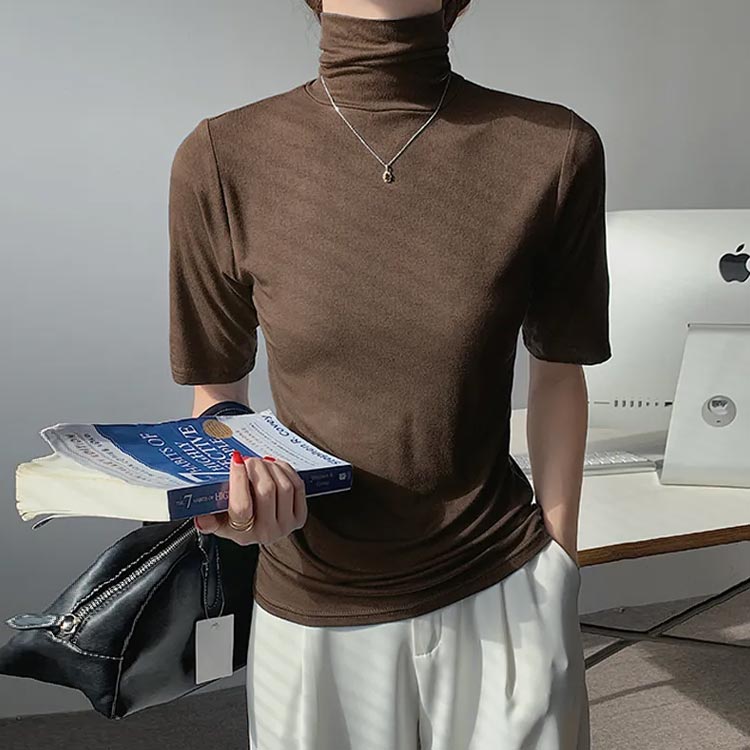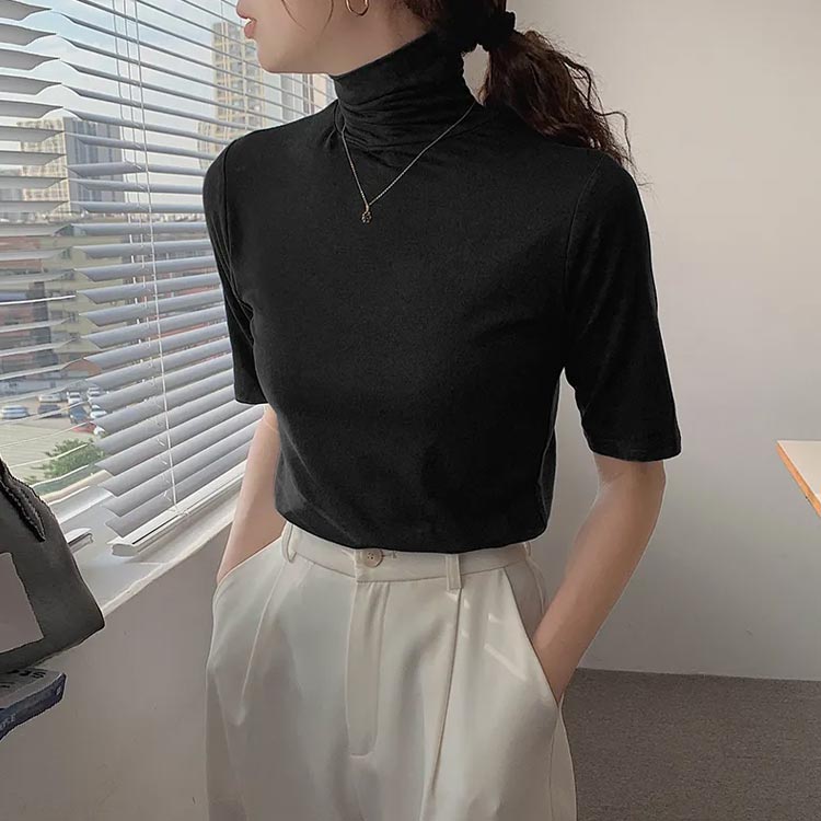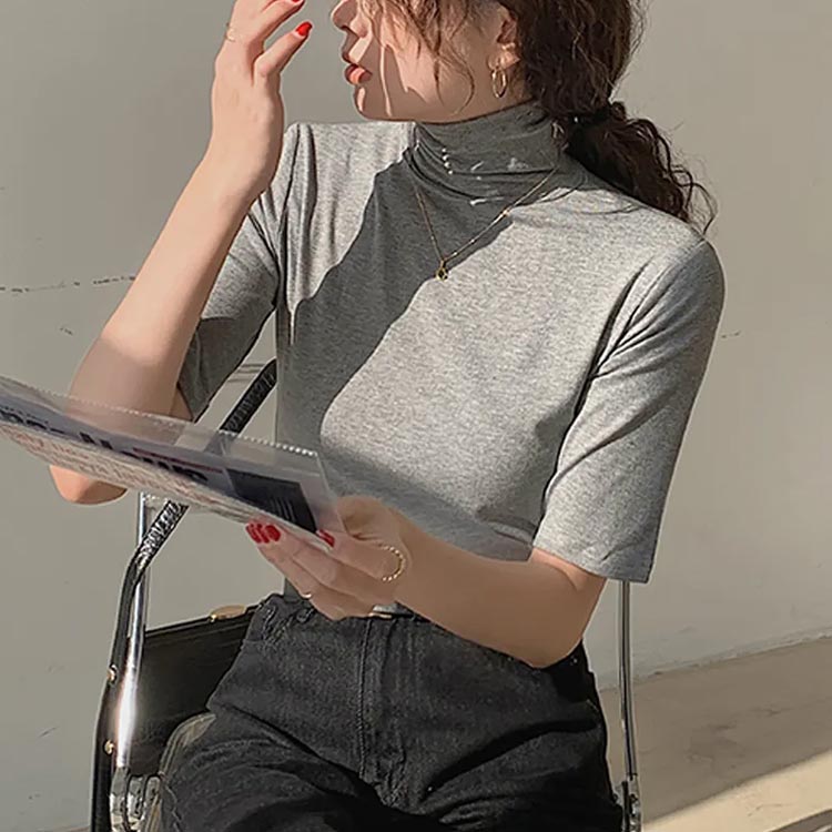ハイネックカットソー 5分袖 薄手 紫