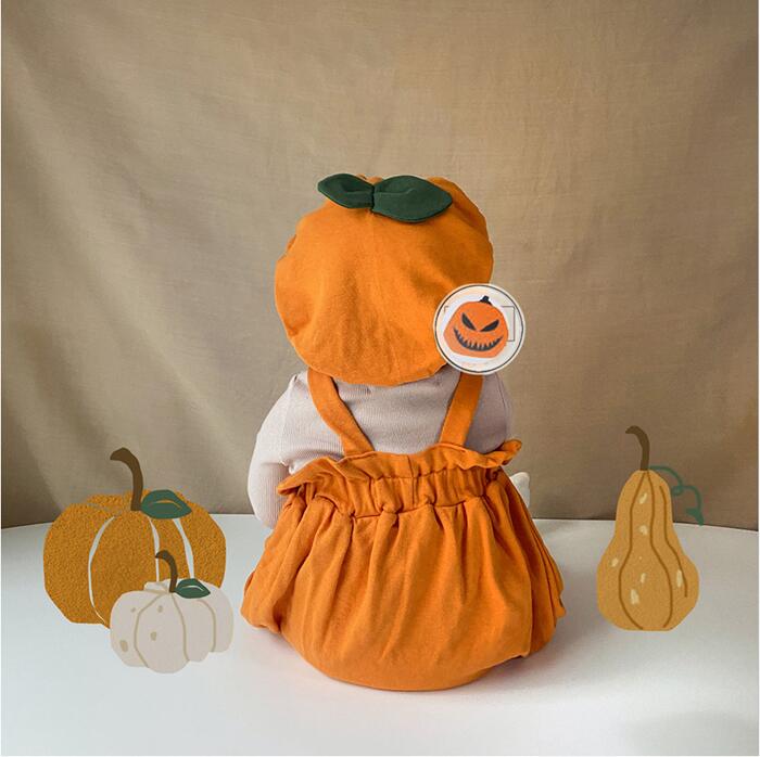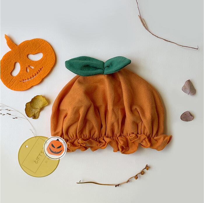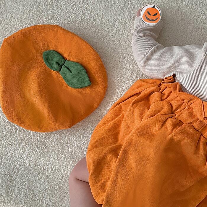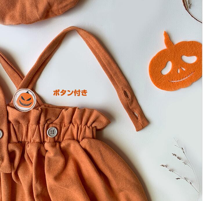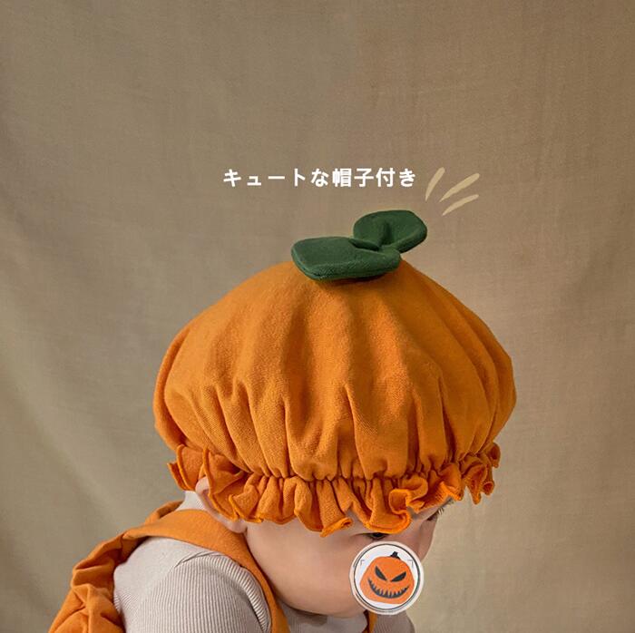 デザインは、鮮やかなオレンジ色のカボチャモチーフで、帽子もセットになっており、一目でハロウィンの雰囲気が感じられます。
