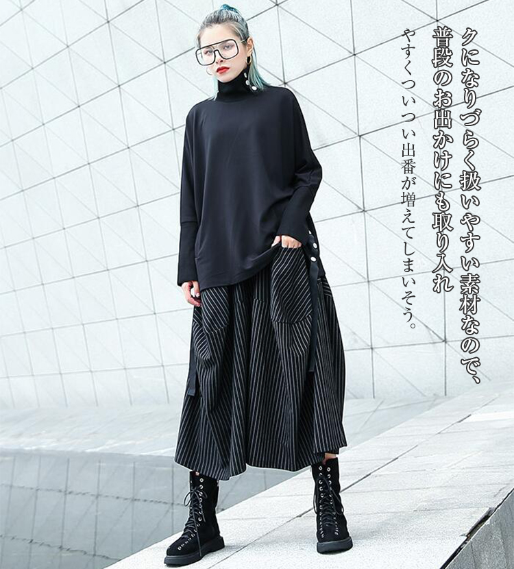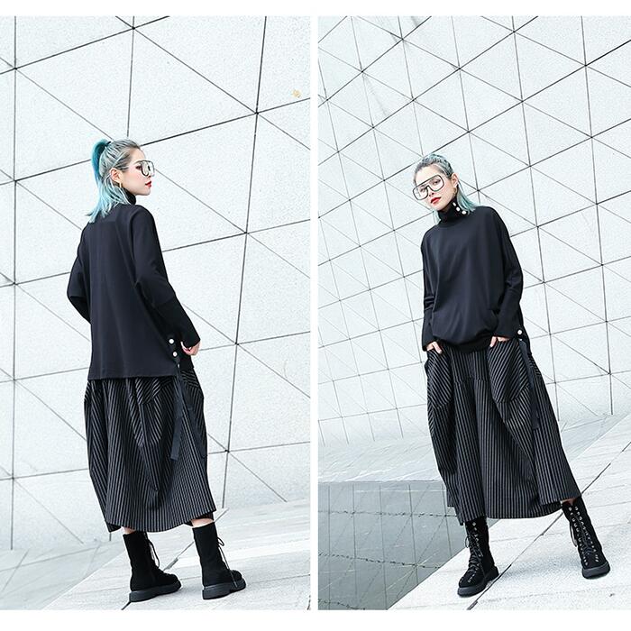 アシンメトリーなストライプ柄スカート風ドレープワイドパンツです。