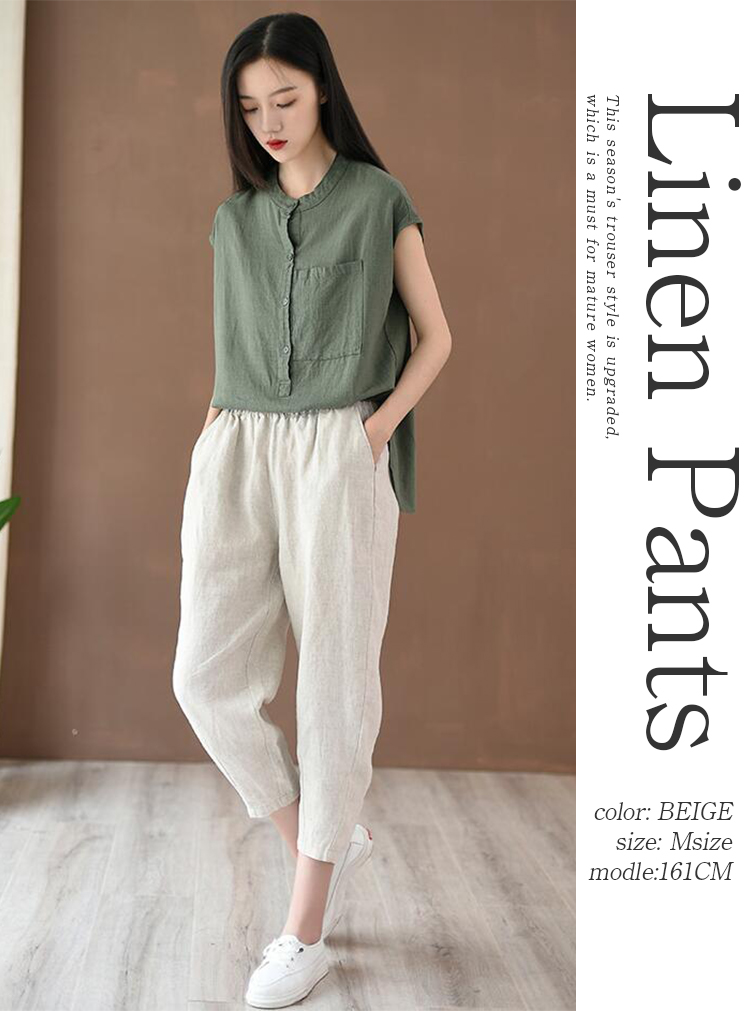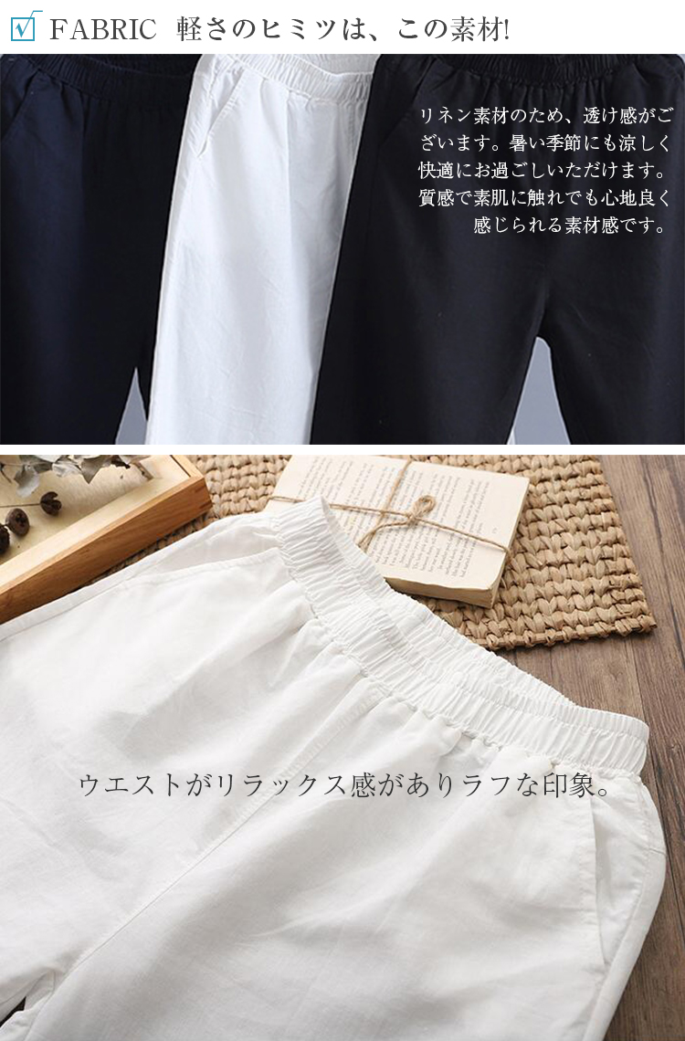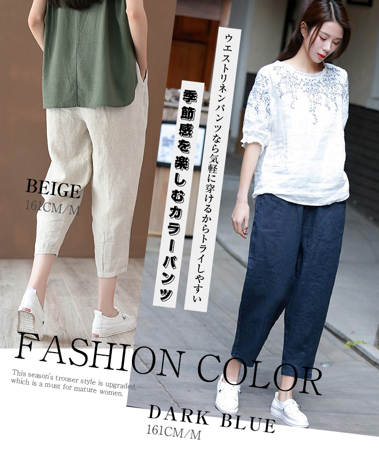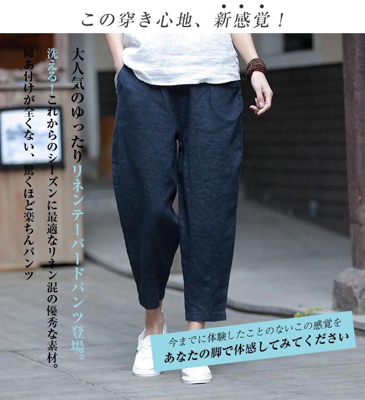 とらみ■商品名リネンテーパード パンツ レディース 春 夏 9分丈 リネン パンツ 麻 亜麻 麻混 タック ロング テーパード リラックスパンツ ウエストゴム 自宅 ボトムス 快適 涼しい ゆったり 大きいサイズ きれいめ ボトムス 美脚 カジュアル 無地 送料無料■サイズ着丈 ヒップ ウエスト もも幅 裾幅 股下 おすすめ体重S 80cm 102cm 62/94cm 62cm 30cm 50cm 44.5kg-55kgM 82cm 106cm 65/98cm 64cm 32cm 52cm 50kg-65kgL 84cm 110cm 68/102cm 68cm 34cm 54cm 65kg-75kg多少の誤差が生じる場合がございます。予めご了承下さいませ■素材リネン70% 綿30%タンブラー乾燥はお避け下さい。■カラー■ネイビー 、ベージュ 、ホワイト、 ブラック、 イエロー画面上と実物では多少色具合が異なって見える場合もございます。ご了承ください。■商品説明『女の子もカッコ可愛くありたい。』