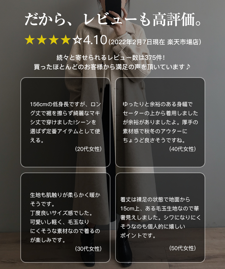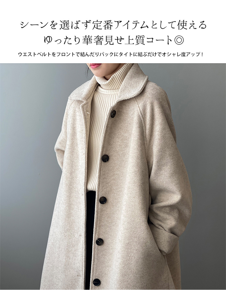 しっかり、かつ柔らかく肌触りのよい生地を使ったテーラードロングコート。