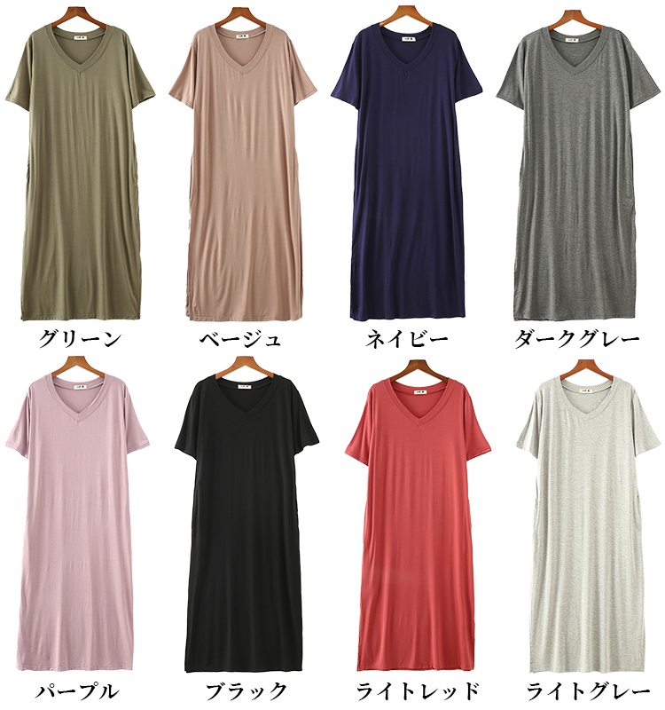 とらみ■商品名tシャツ ワンピース レディース 夏 半袖 Vネック tシャツワンピース ルームウェア ワンピース ロングワンピース スリット 柔らか 綺麗 通気性 吸湿速乾 部屋着 シンプル 送料無料■サイズ着丈 胸囲 肩幅 袖丈L 110cm 100cm 46cm 22cmXL 113cm 100cm 52cm 24cm多少の誤差が生じる場合がございます。予めご了承下さいませ■素材モーダル 100%タンブラー乾燥はお避け下さい。■カラー■ネイビー ブラック ライトグレー ダークグレー ベージュ グレー ライトレッド パープル画面上と実物では多少色具合が異なって見える場合もございます。ご了承ください。■商品説明『着るだけでお洒落可愛い私に。』