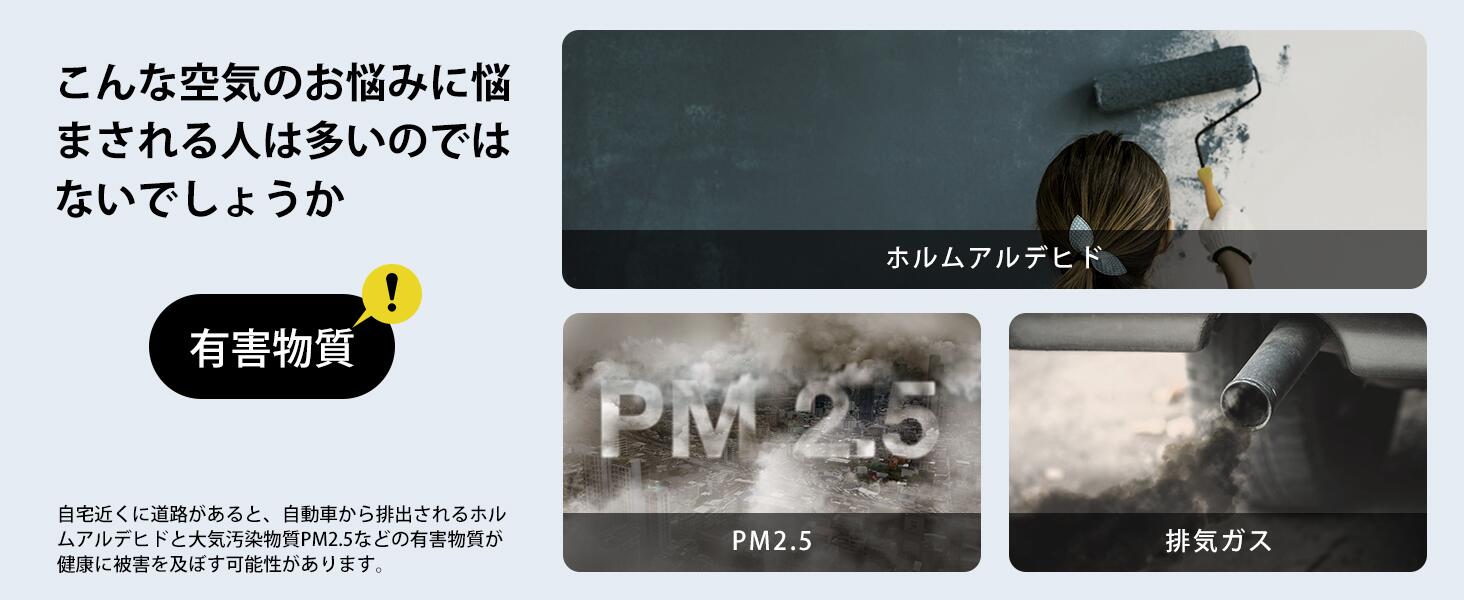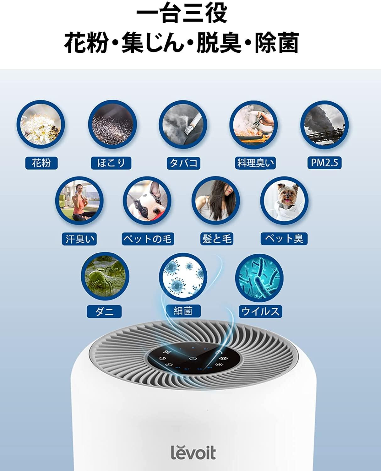 日本の技術を採用したhepaフィルターにより、花粉・菌・ウイルス・アレルギー物質・ホコリ・ハウスダスト・カビ・細菌・PM2.5・黄砂など、0.1μmまでの微粒子を99.97%除去し、花粉症・アレルギー症状・ウイルス対策に役立ちます。脱臭専用のハイグレード粒状活性炭フィルターにより、タバコ臭、ペットの臭い、料理の臭い、カビ臭いなど、家庭でよくある臭いをしっかり除去します。抗菌コートにより有害な細菌・ウイルスを除去し、フィルター内の細菌の再増殖を抑えます。