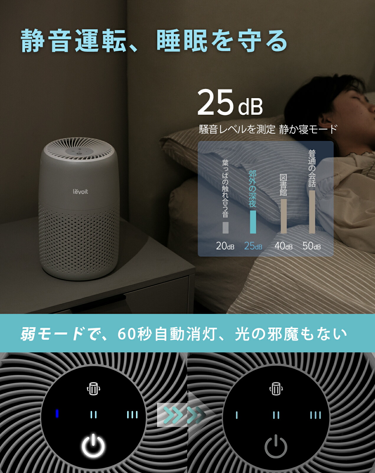 独自開発の静音技術と特殊な内部構造で運転音を25dB以内に抑えます。自動消灯機能でパネルの表示灯が操作後1分で自動で消えます。音と光をコントロールする事により睡眠の邪魔になりません。