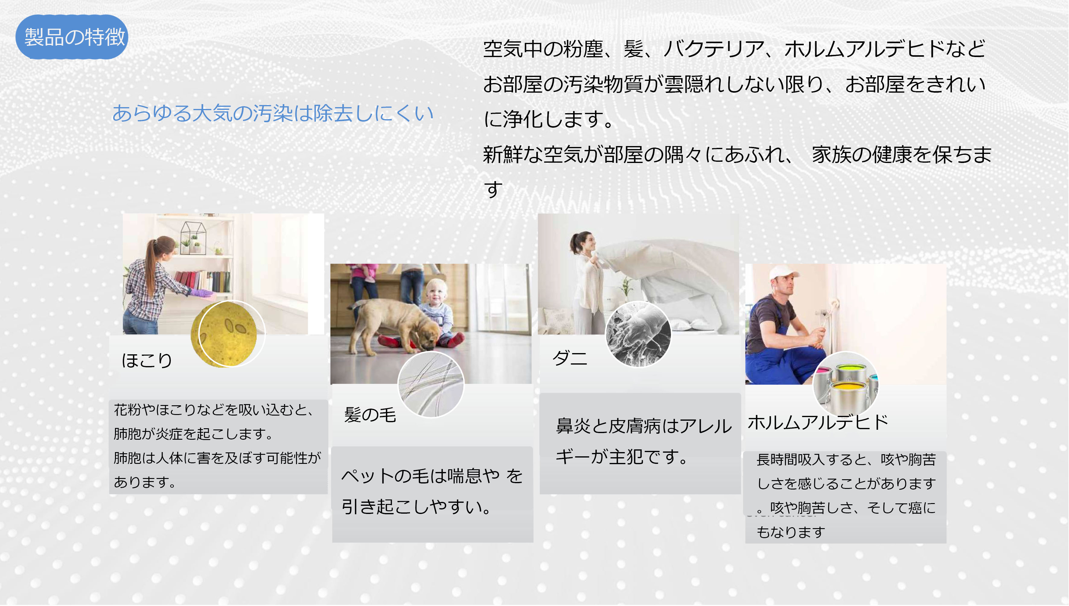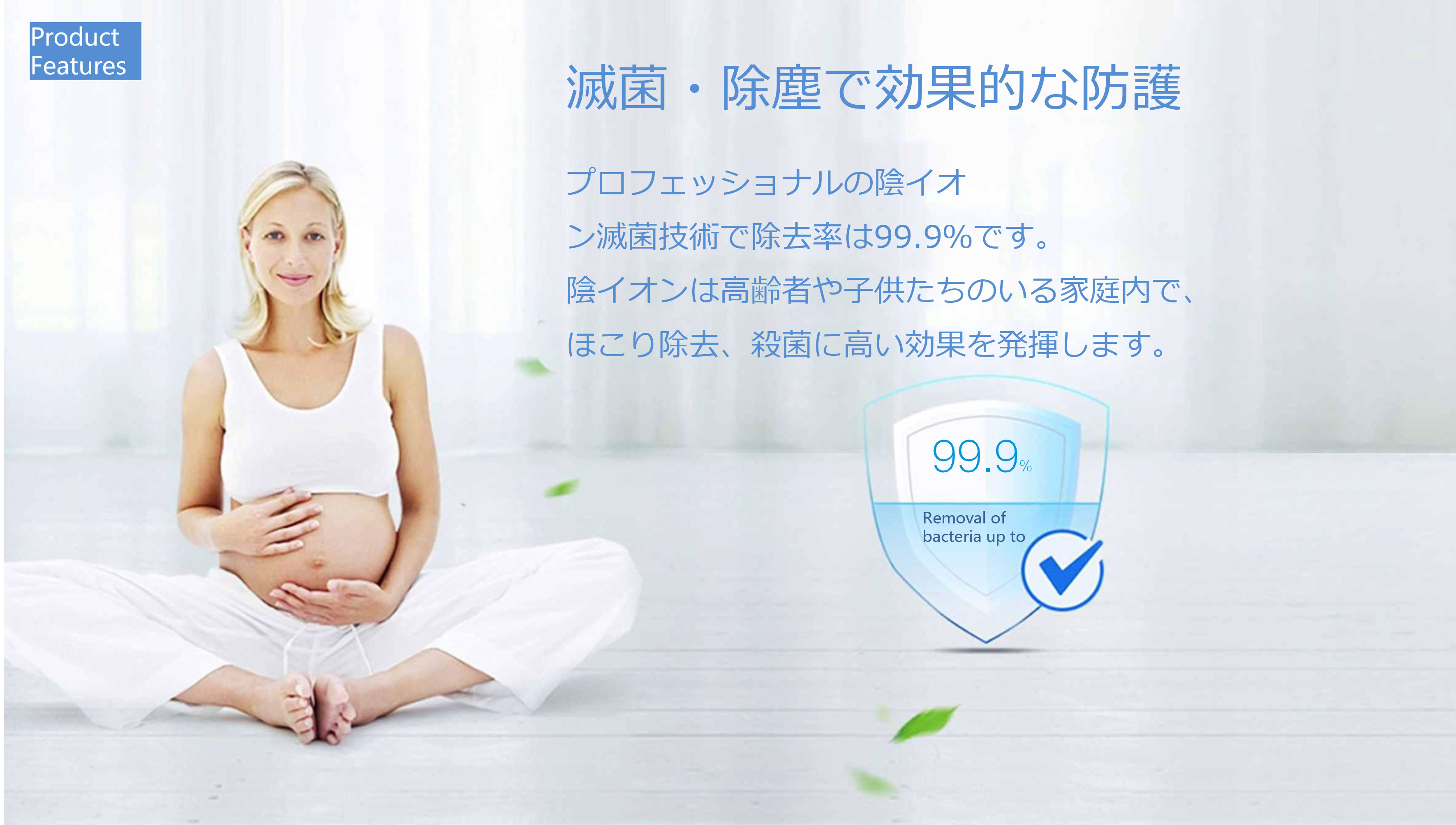 500万マイナスイオンと細菌が結合した後に、細菌に構造の変更やエネルギーの転移を発生させ、最終的に地面に沈んで、空気中の細菌を急速に減少させます。同時にマイナスイオンは空気中の と結合して沈殿することができて、 を集める目的を達成しました。3層の高性能な一体化カートリッジに500万マイナスイオンを加え、2重の除菌、除味効果が抜群です。そのほか、マイナスイオンは大脳皮質の机能と脳の活働を強化し、精神を奮起させ、仕事の効果を高め、睡眠の質を改善します。