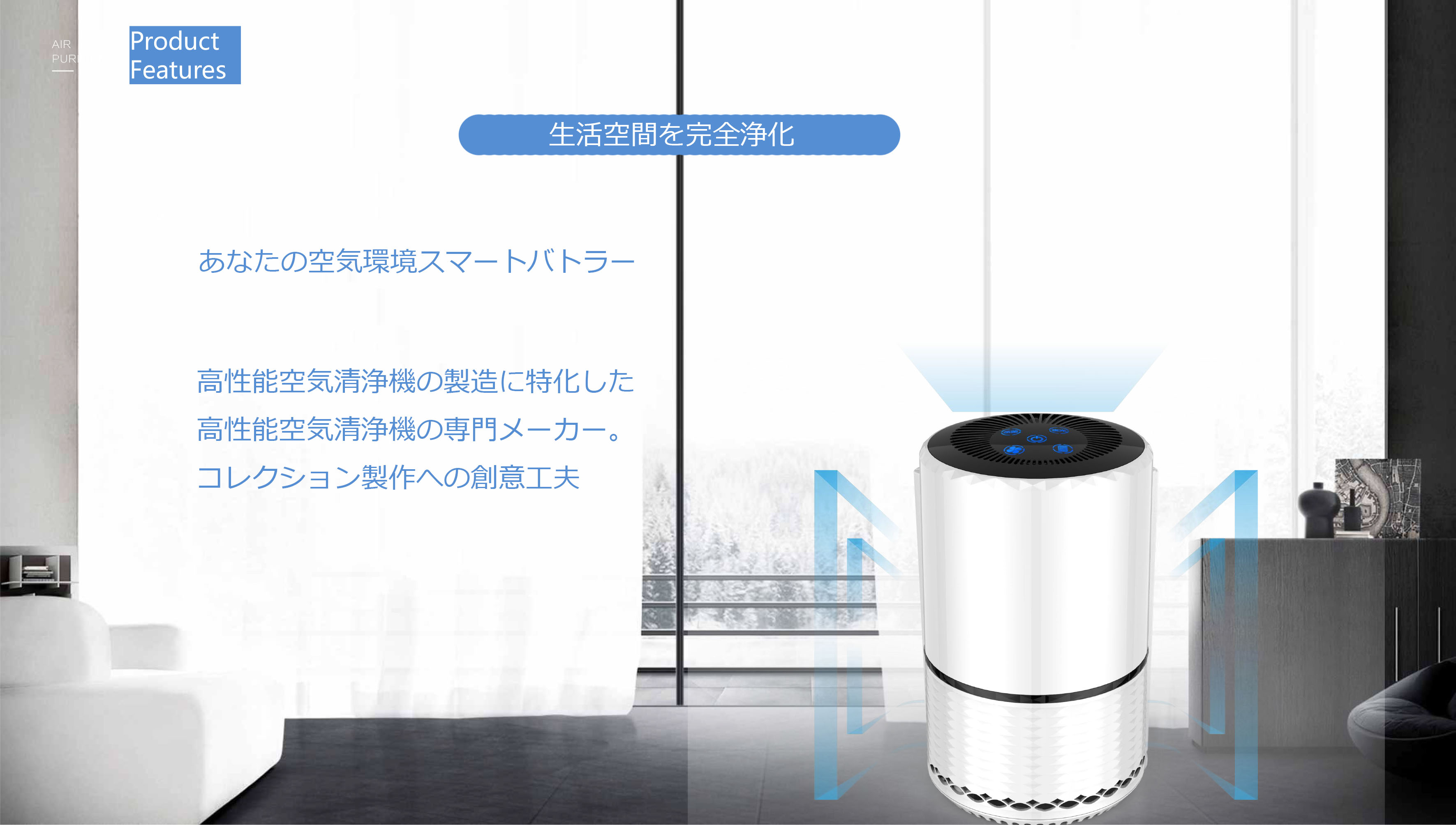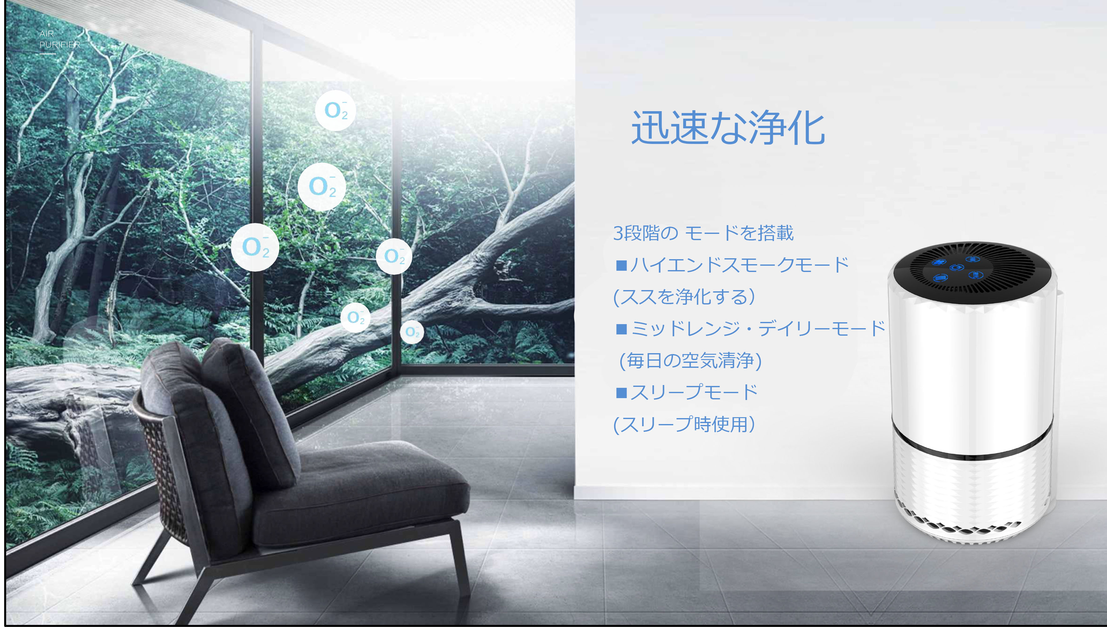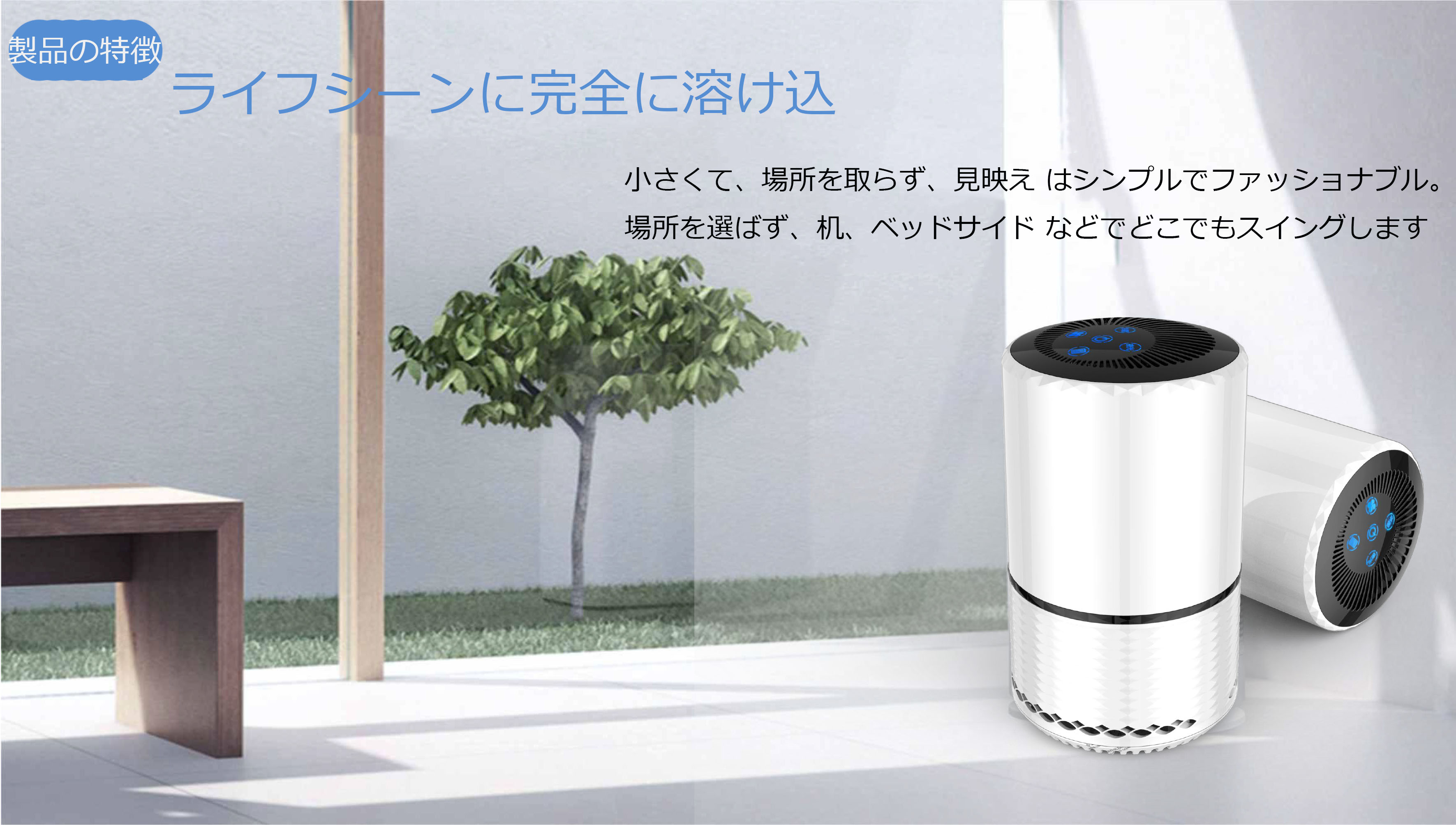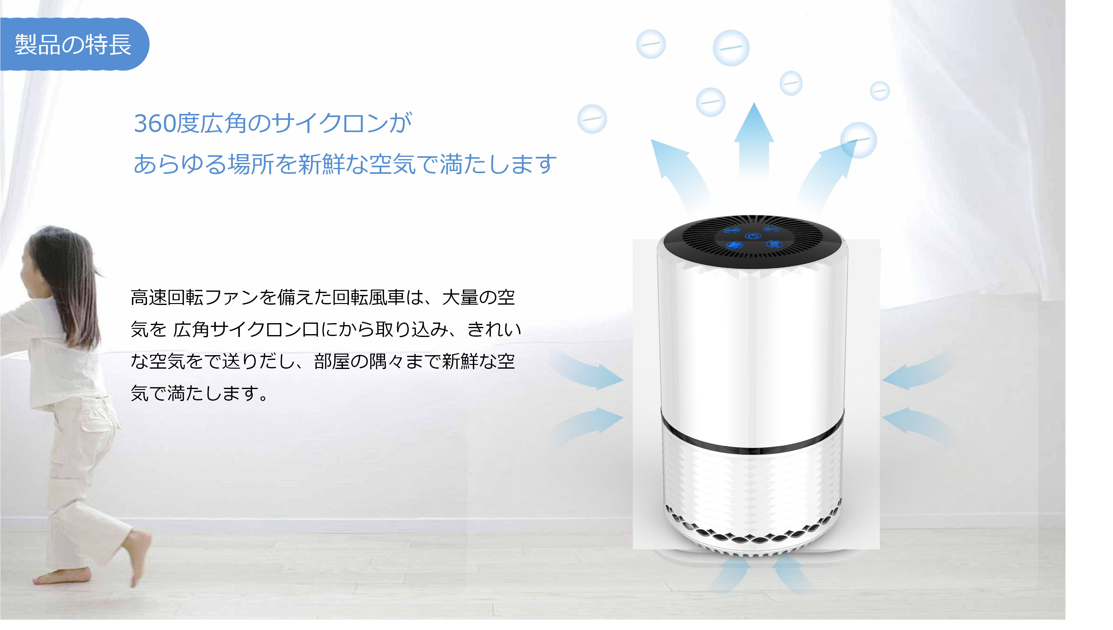 360°広い吸引口の設計でより広範囲な吸気が実現し、さらに先進なターボチャージャー技術を加え、汚れた空気を強く吸収し、真上にキレイな空気をパワフルに送り出し、室内空気を効率よく循環させ、18畳までのお部屋を浄化できます。寝室や一人暮らしの小スペースは勿論、オフィスやリビングのような広いスペースでのご使用も、人気を集めています。コンパクトで棚の間や隅辺に置いても邪魔にはなりません。また、白く上質でスタイリッシュな本体なので、どのようなお部屋にもなじみます。