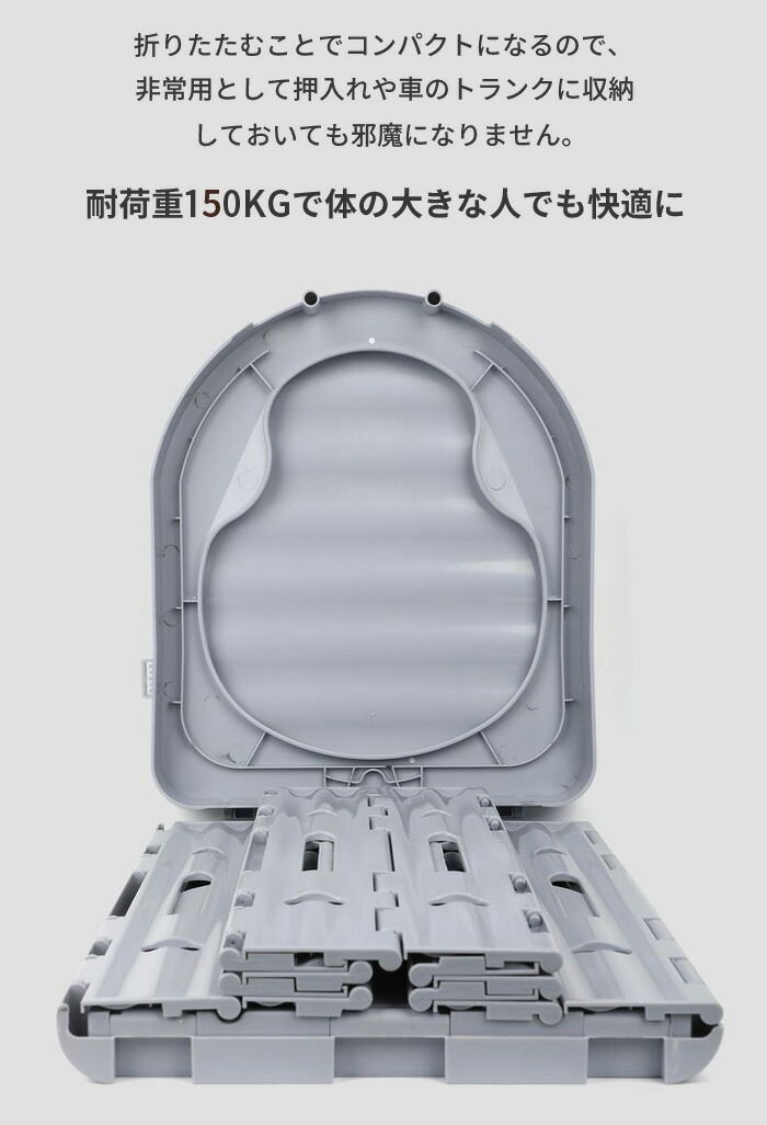 耐荷重は150kg。耐久性に優れた丈夫な設計で、誰でも気軽に使用できる簡易トイレです。