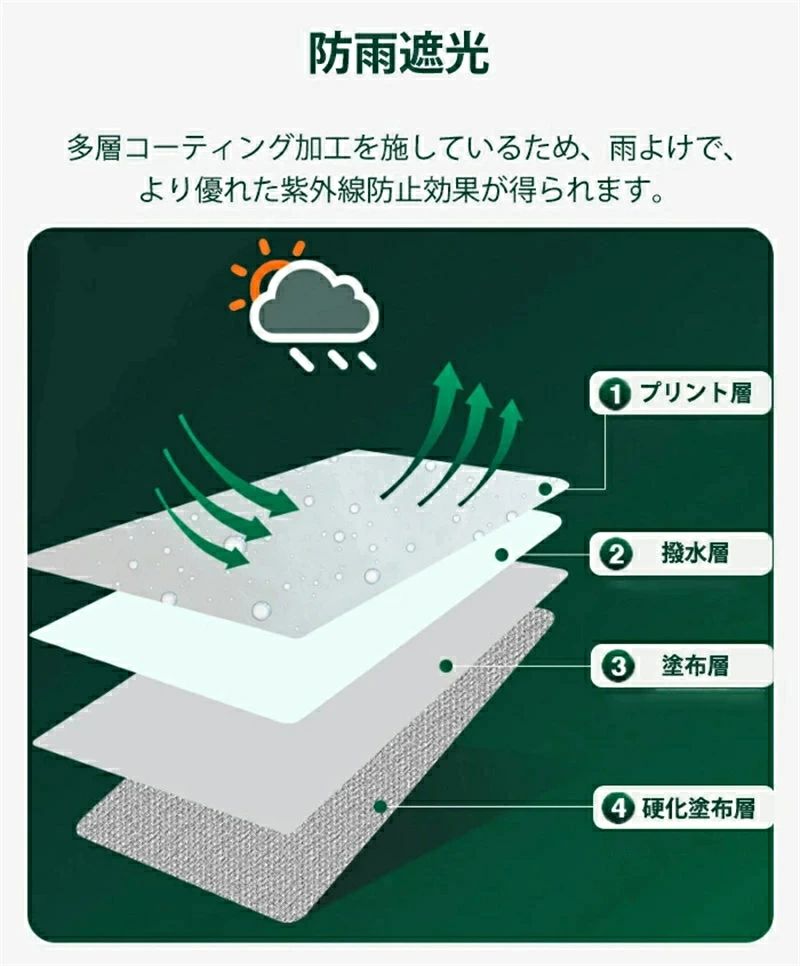多層コーティング加工を施しているため、雨よけで、 より優れた紫外線防止効果が得られます。