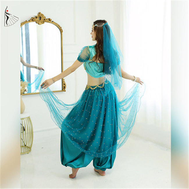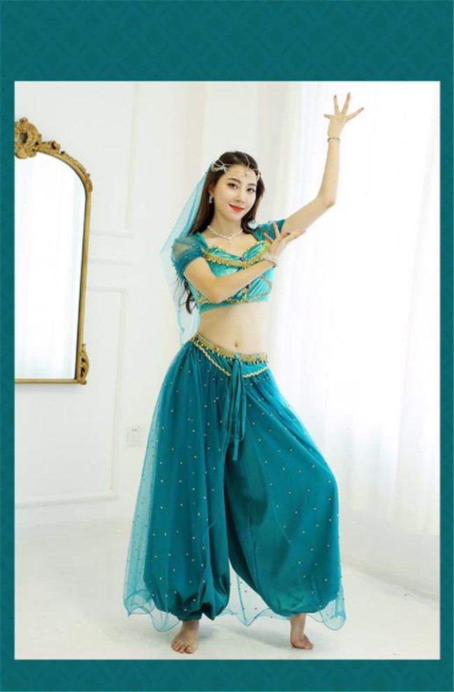ブルー 上下セットベリーダンス衣装 舞台服演出用レッスン着 ステージ衣装、練習用レッスントップス+ズボン+ベール3点セット ブルーステージ衣装練習用 ベリーダンス ステージ衣装イベント ショートスカー