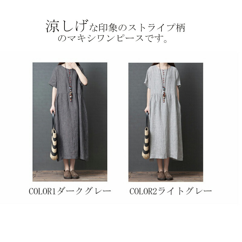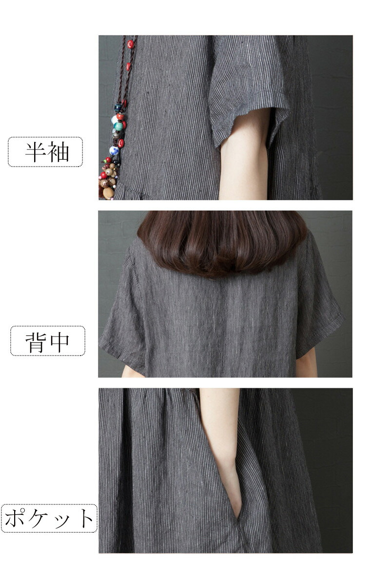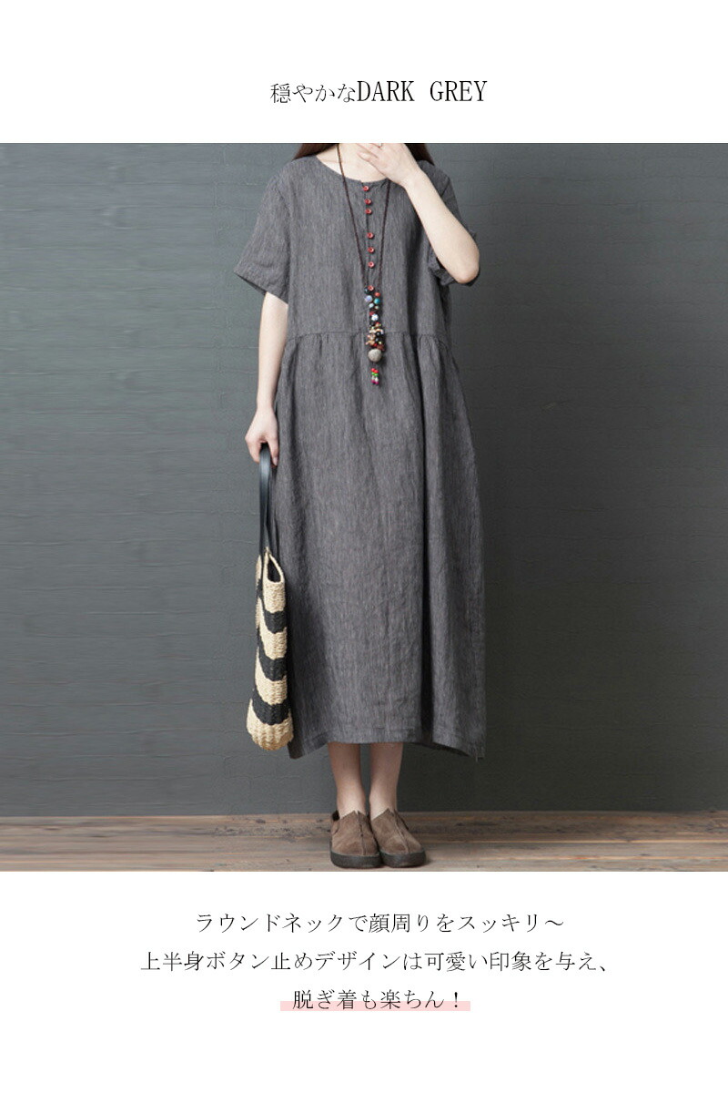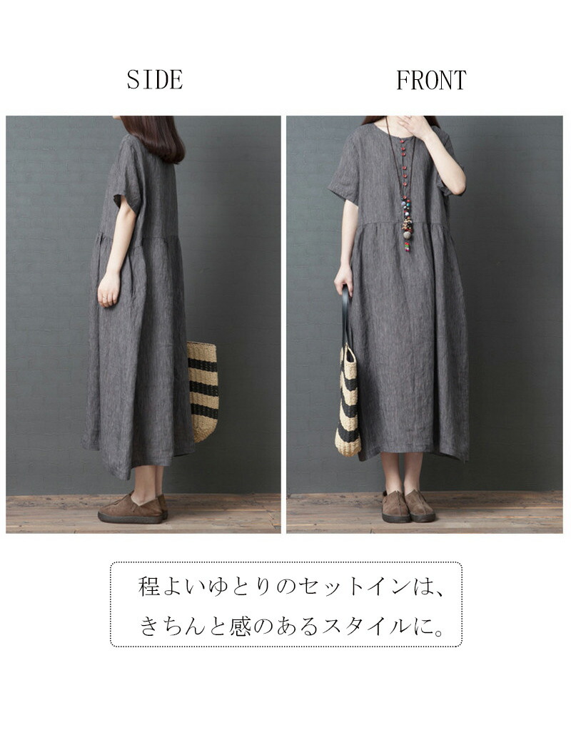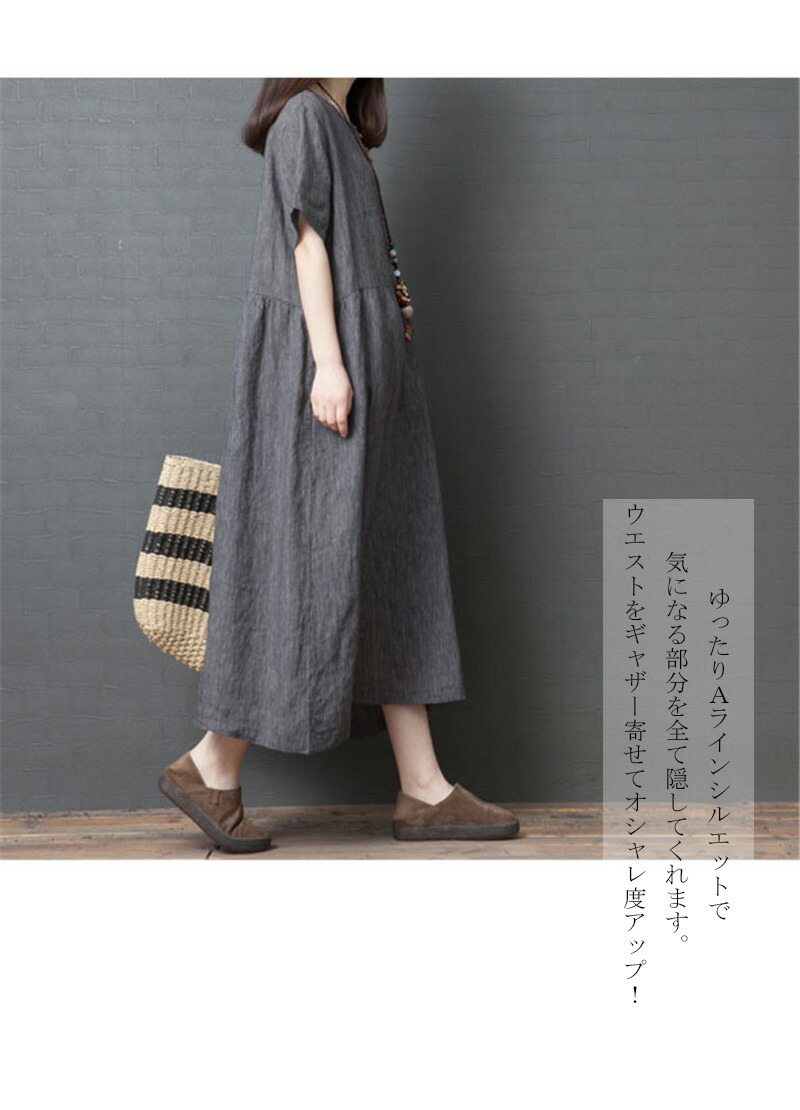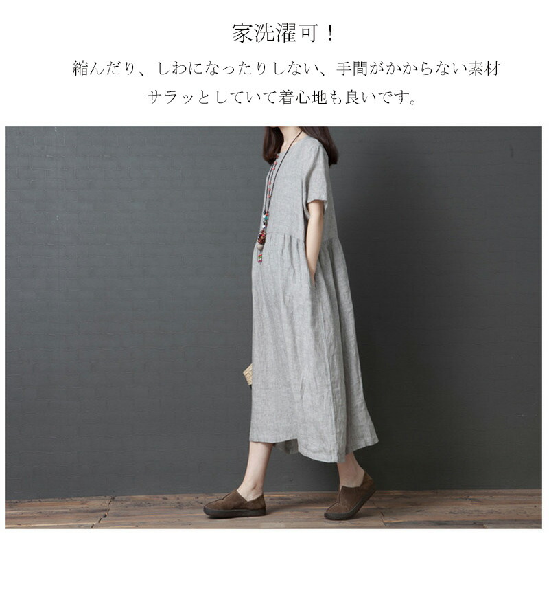 ギャザーづきサマー綿麻半袖ワンピース