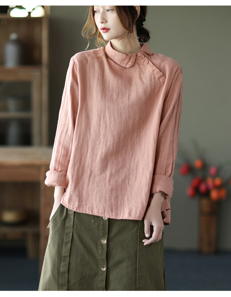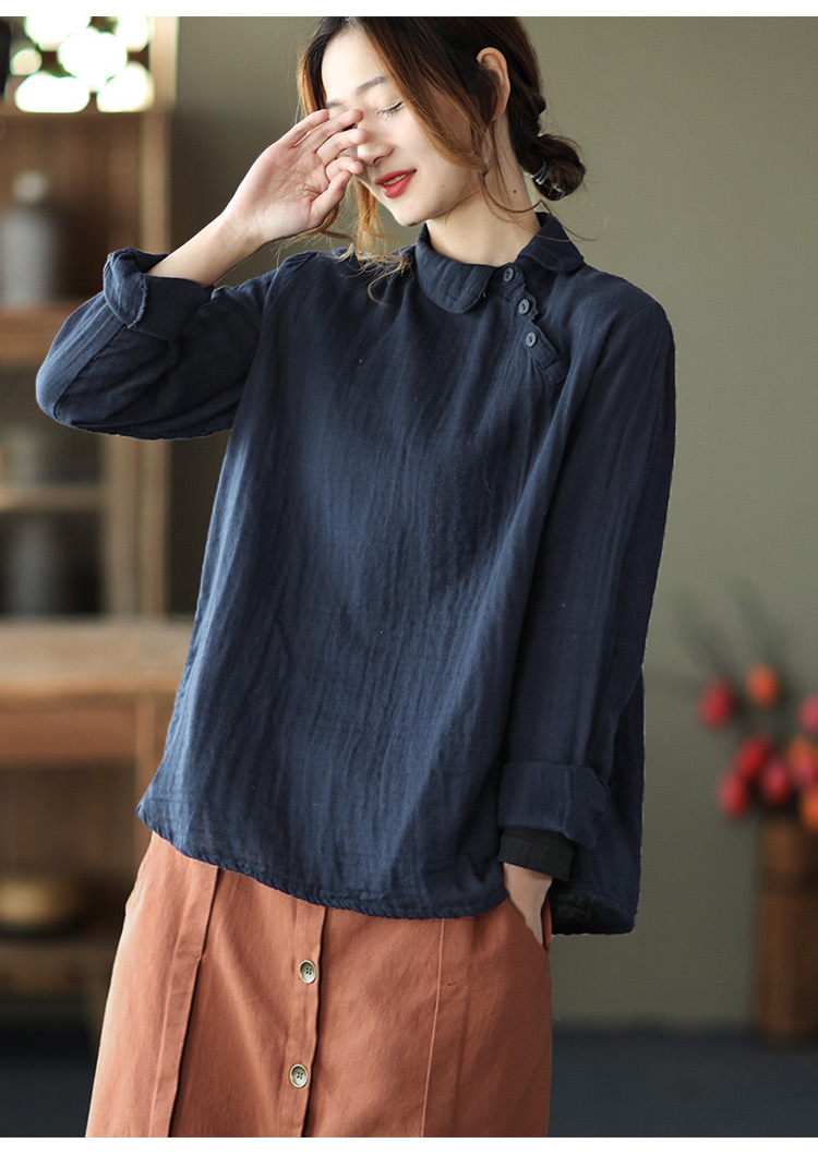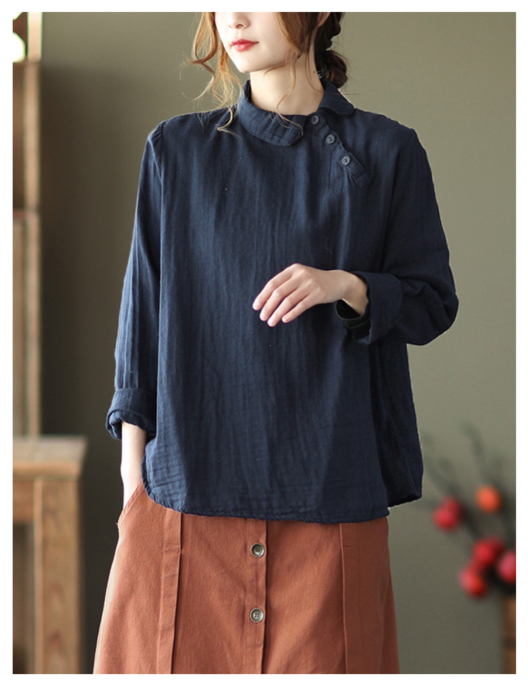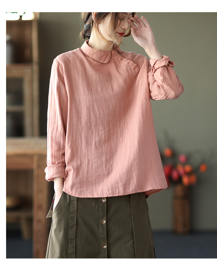 襟デザイン可愛い長袖綿シャツ ガーゼシ