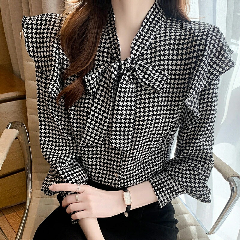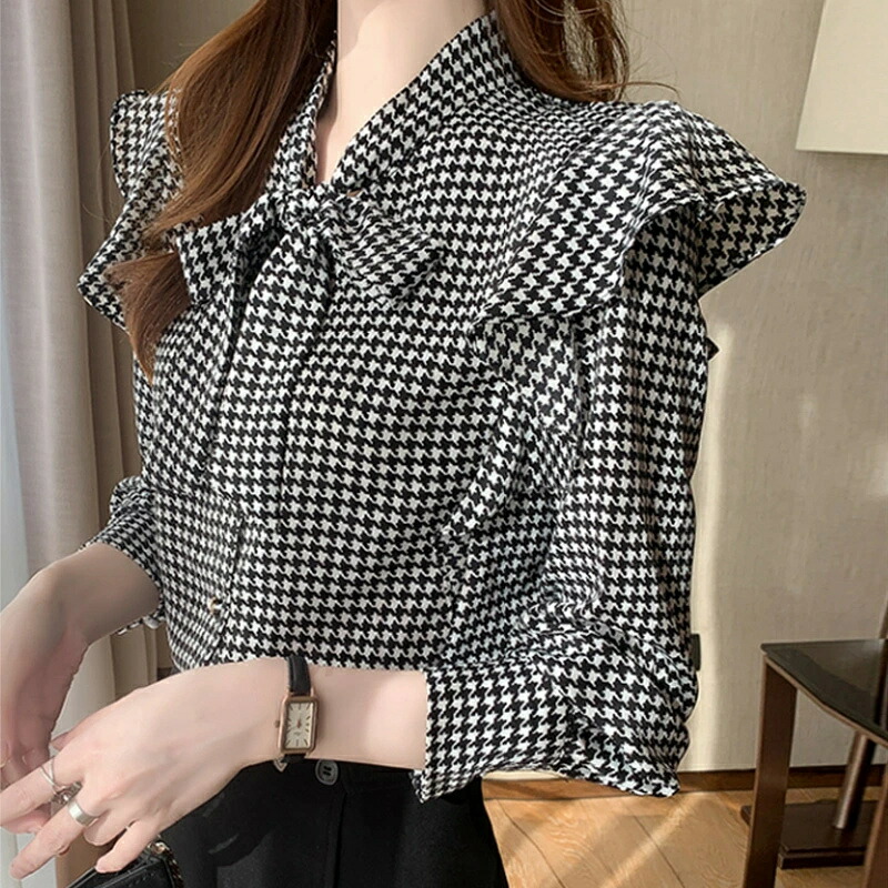 商品名 ボウタイ リボン ブラウス 千鳥格子 ボウタイブラウス レディース 長袖 トップス リボンブラウス 千鳥柄 総柄 フリル 肩 シャツブラウス 前開き オフィス オフィスカジュアル フェミニン レトロ 春 夏 秋 韓国 ファッション 送料無料