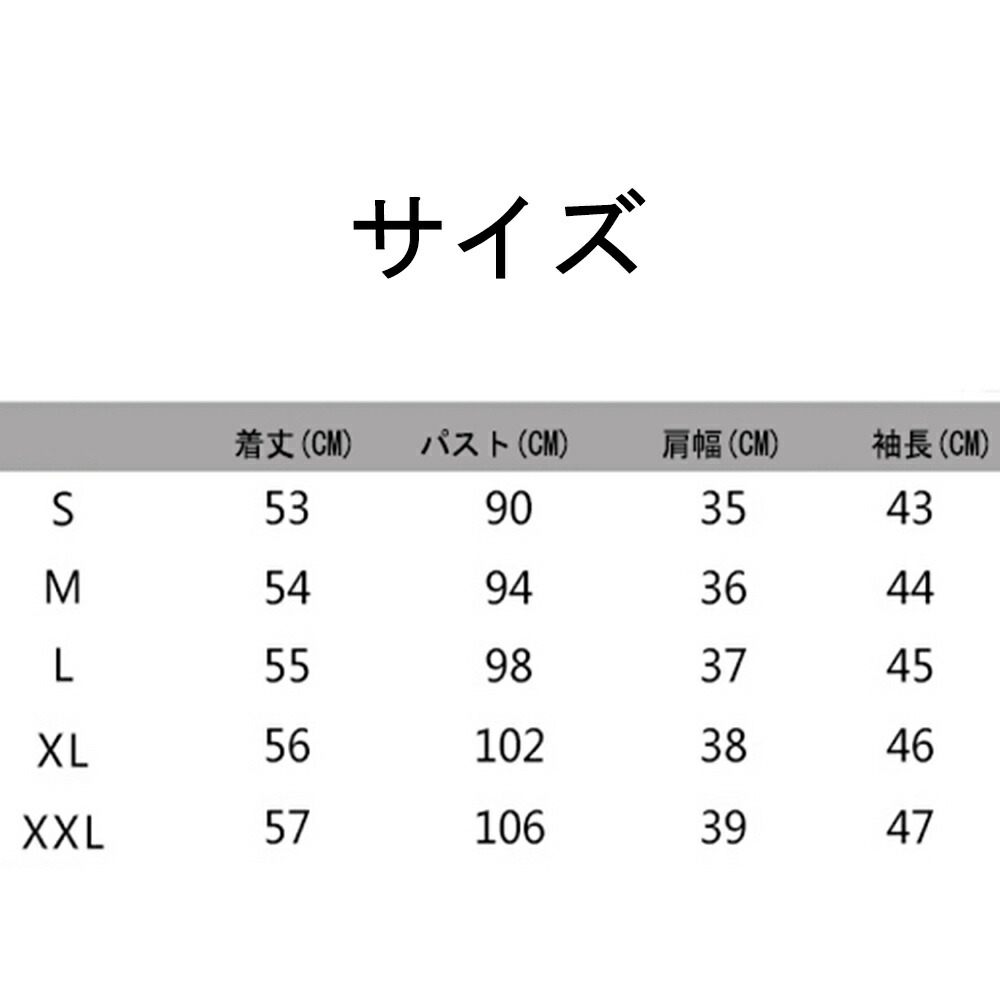 サイズ(cm):S、M、L、XL、XXL S:パスト:90CM 着丈:53CM 袖長:43CM 肩幅:35CM