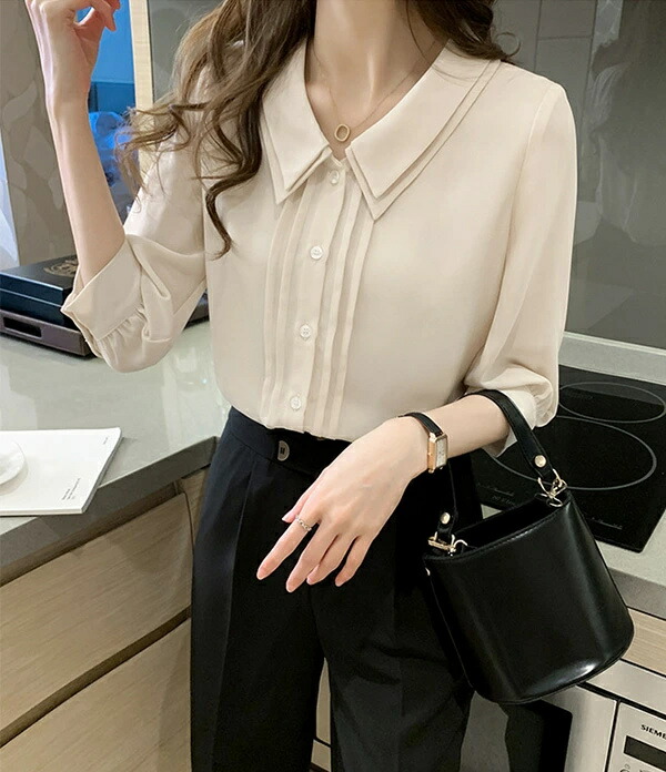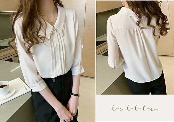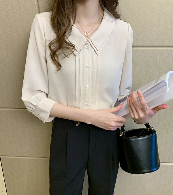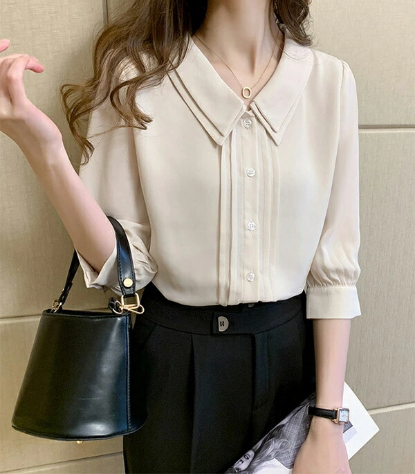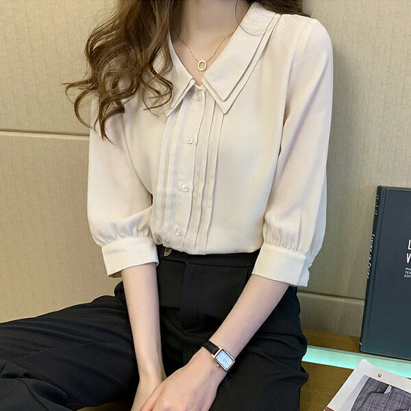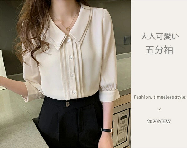 ブラウス 五分袖 丸襟 着回し シフォン ボタン 高級感 オフィス OL 通勤 デート 無地 薄手 秋 春 夏 韓国ファッション カジュアル かわいい
