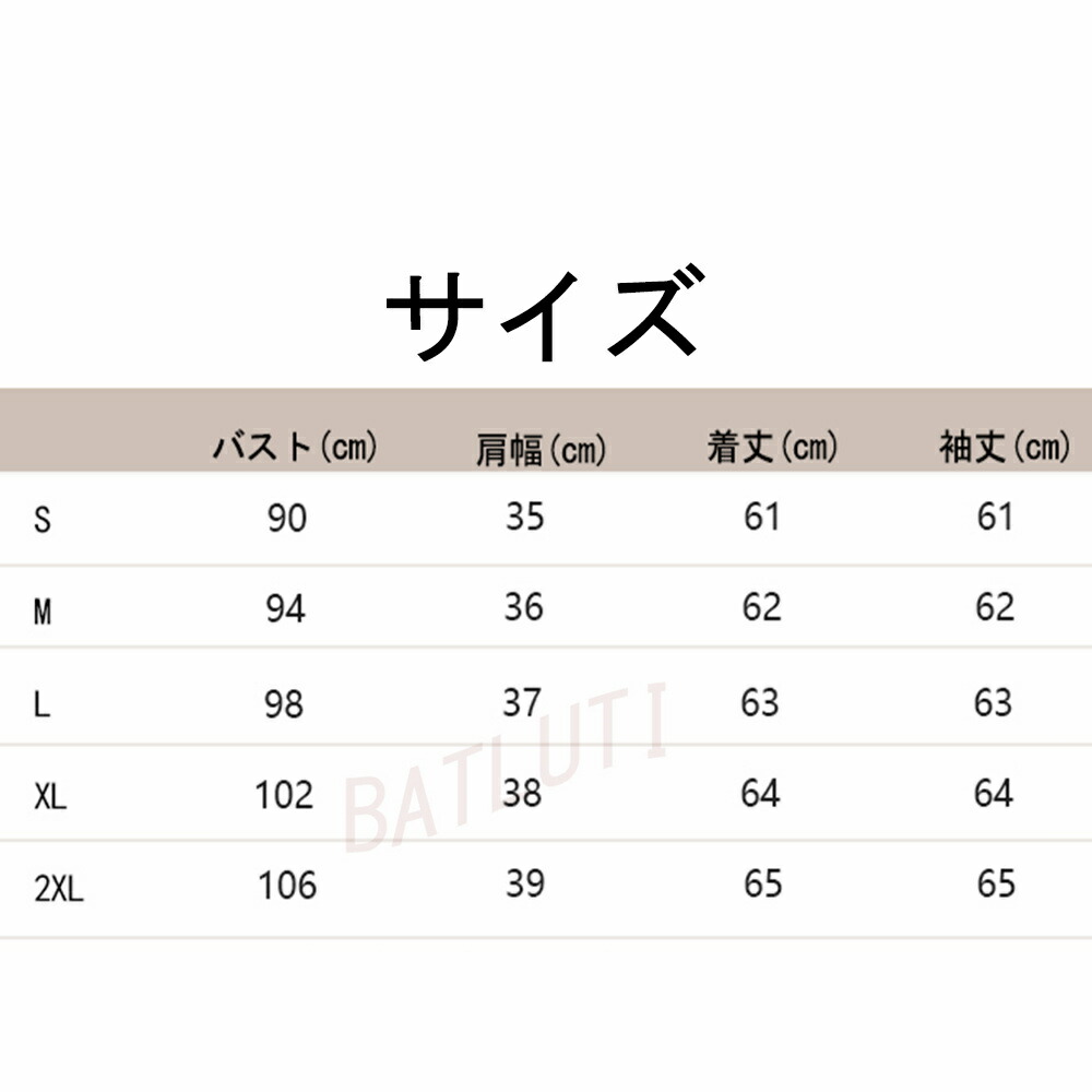 サイズ(cm)S、M、L、XL、XXL S:パスト:90CM 着丈:61CM 袖長:61CM 肩幅:35CM