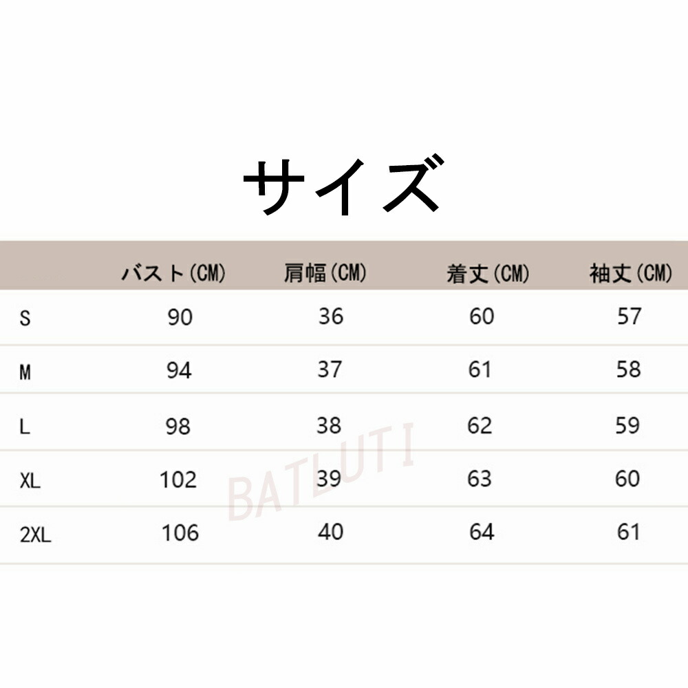 サイズ(cm)S、M、L、XL、XXL S:パスト:90CM 着丈:60CM 袖長:57CM 肩幅:36CM