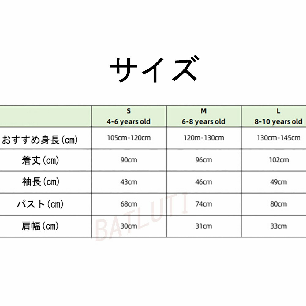 サイズ(cm):S、M、L S:バスト:68CM 着丈:90CM 袖長:43CM 肩幅:30CM おすすめ身長:105-120CM