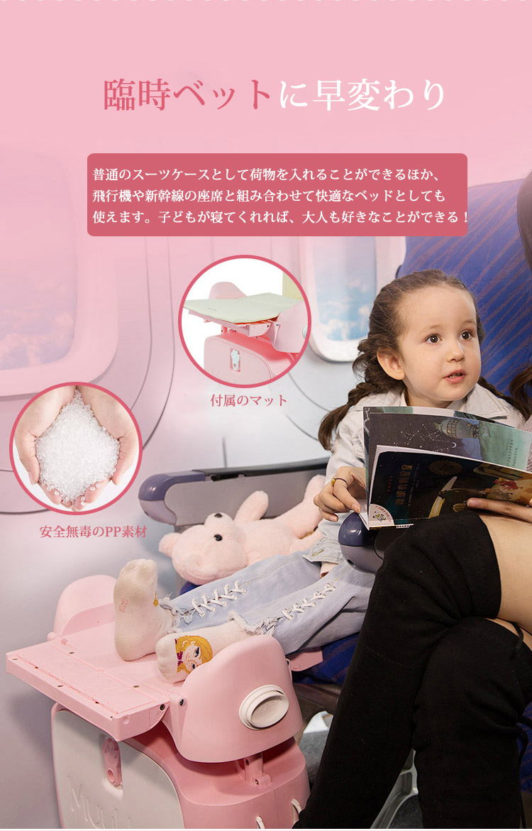 普通のスーツケースとして荷物を入れることができるほか、 飛行機や新幹線の座席と組み合わせて快適なベッドとしても使えます。子どもが寝てくれれば、大人も好きなことができる!