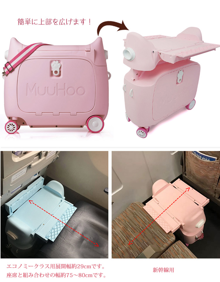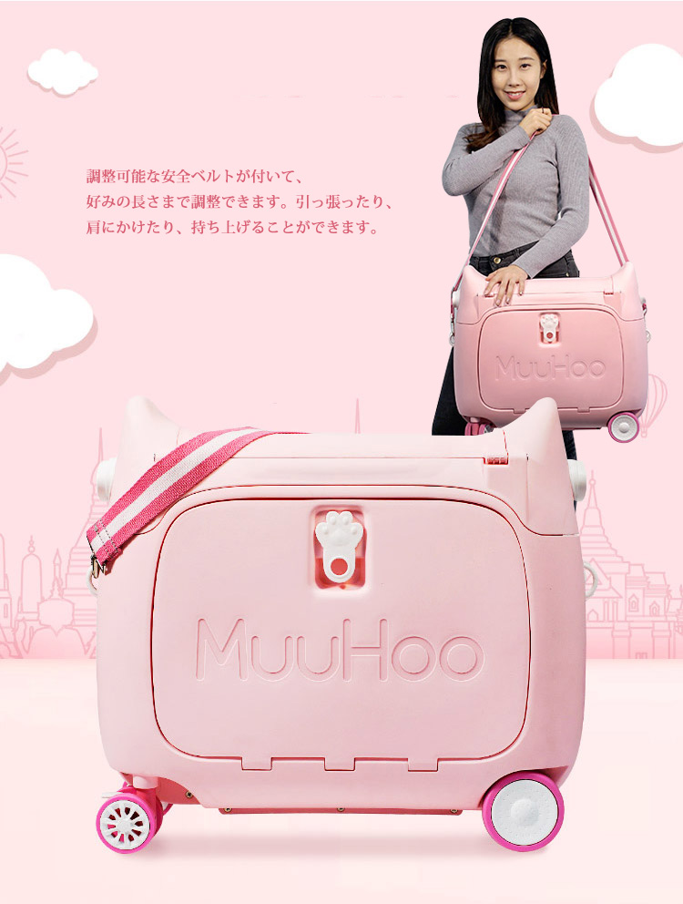 丈夫な幅広ベルトが付きます。お子様が上に乗ったり、引っ張ったりすることができます。空港ターミナルでもスムーズに移動でき、お出かけも楽しくなります。