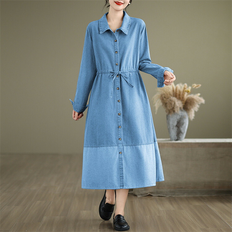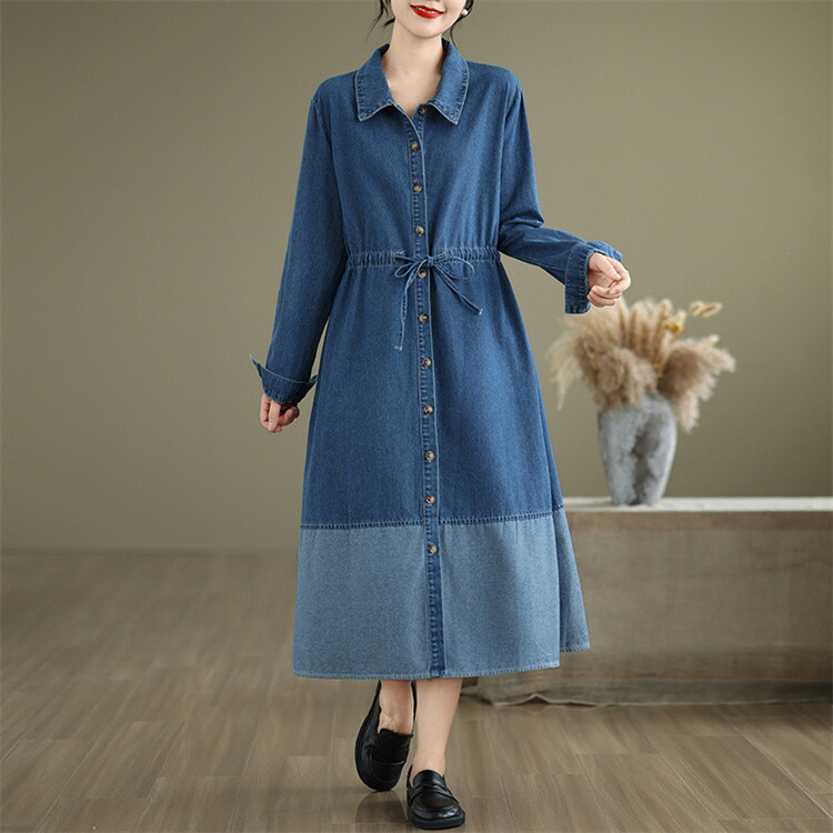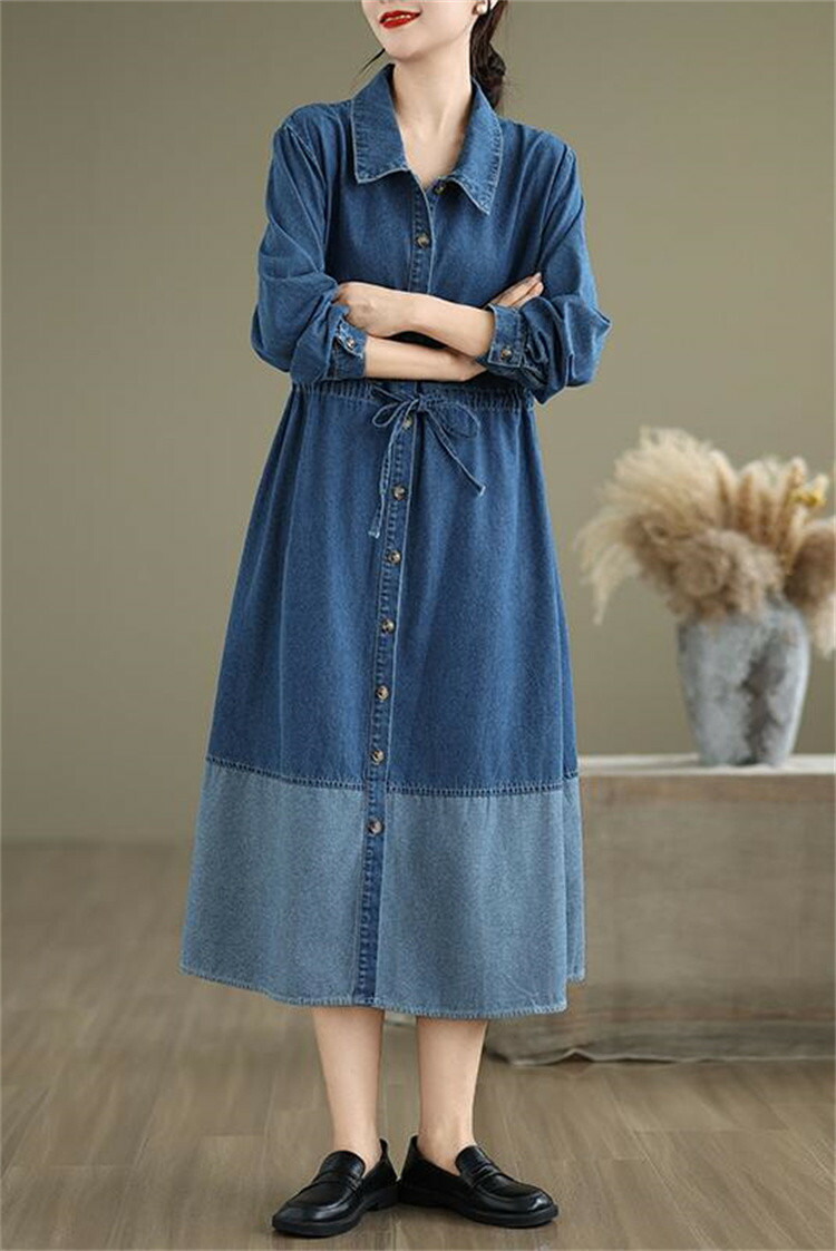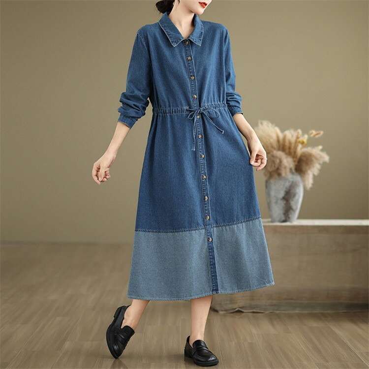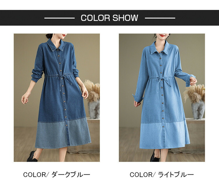 商品名 フレアパンツ デニムワンピース ワンピース 春秋 デニム シャツワンピース レディース 長袖 前開 ダブルカフス シャツ ボタン きれいめ ベルテッド リボン 膝下 20代 30代 40代 OL